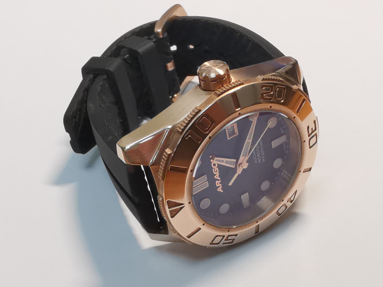 Циферблат черного цвета, возможно пластиковый, имеет мелкую шершавую текстуру "грубой листовой резины или рубероида". На циферблате, по периметру нанесена белой краской минутная разметка. Надпись Aragon, выполнена крупными золотыми с красновытым отливом буквами, курсивом, рубленым шрифтом. Надписи: Automatic,Professional, w.r.200m/660ft, japan mov't, выполнены рельефно белой краской. Окошко даты оформлено прямоугольной металлической рамкой золотого цвета.