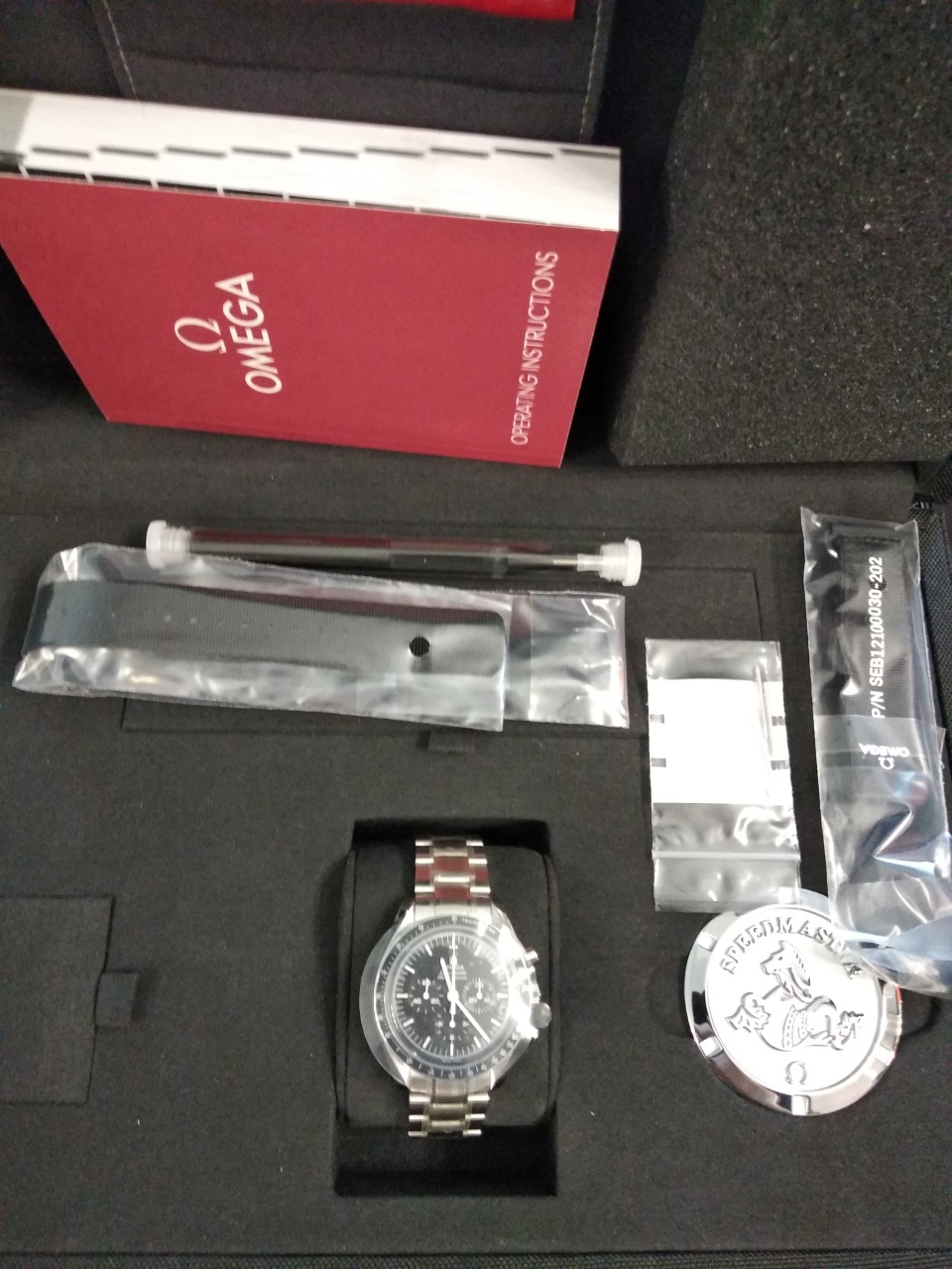 Эта модель OMEGA Speedmaster Professional "Moonwatch" имеет накрытый хезалитовым стеклом черный циферблат с малой секундной стрелкой, 30-минутным и 12-часовым счетчиками, центральной стрелкой хронографа. Черный безель с тахиметрической шкалой закреплен на корпусе диаметром 42 мм из нержавеющей стали. Часы дополняет стальной браслет.