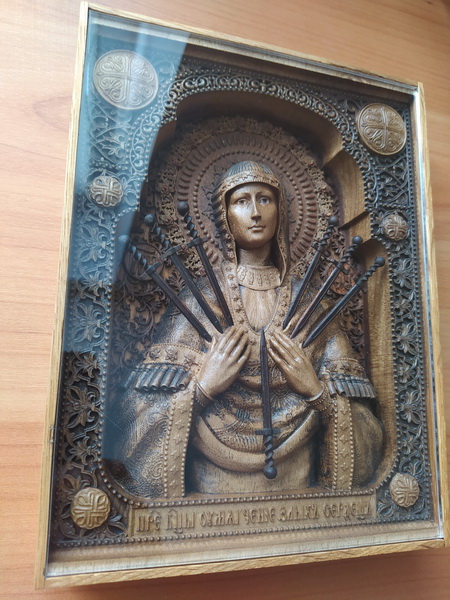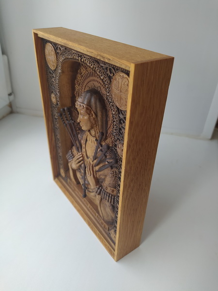 Одна из самых почитаемых икон. Качество и степень детализации на фото. Икона выполнена из светлого ореха, подложка и рамка - дуб, нимб - красное дерево, решетка на подложке - темный орех, мечи - темных орех. Защитное стекло установлено для сохранности плотной посадкой без клея, может быть легко снято или закреплено капелькой клея (но оно и так само собой не выпадет). В такой сложности работа скорее всего повторяться не будет из-за огромной трудоемкости и технологической сложности. Шикарный подарок супруге, маме, сестре. Технология - ЧПУ, фреза 0,25 и руки, руки, руки. Пропитка - только натуральное, химией не пользуюсь никогда. Масла с восками (хитрая смесь) и сиккатив для ускорения полимеризации.