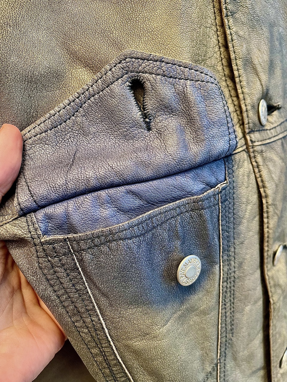 Эксклюзивный кастомный кожаный Trucker Jacket. Единственно существующей экземпляр. За основу взята куртка Blue Star. Кастомная подкладка, тонкая кожа ягненка с фактурной выделкой. Куртка была кастомизирована в custom studio los angeles. Непосредственно коже придали винтажные вид и эффект выгорания/выцветания. Изначально куртка была небесно-синего цвета, по итогу стала зелено-оливковая с градиентом в песочно-оливковый.