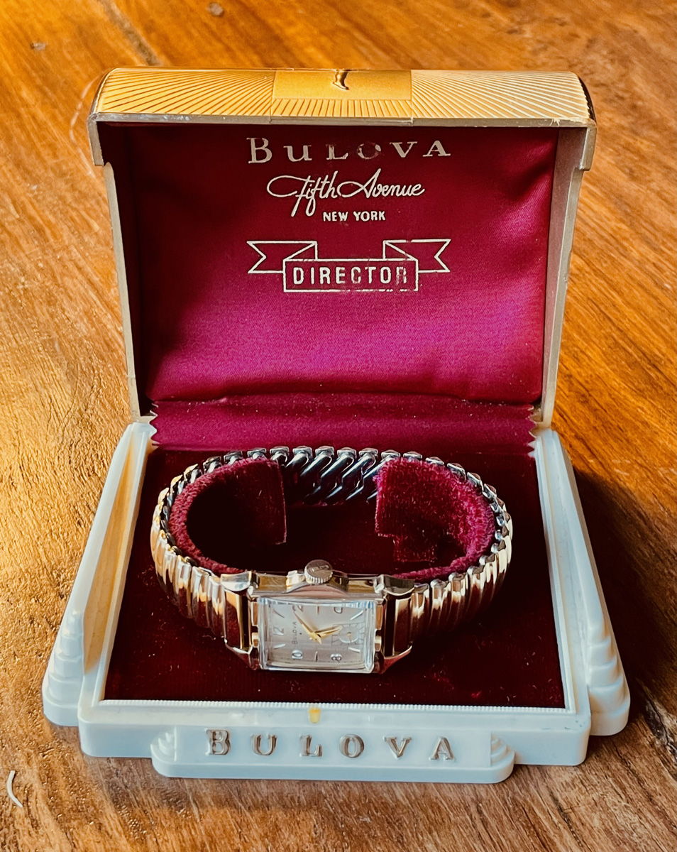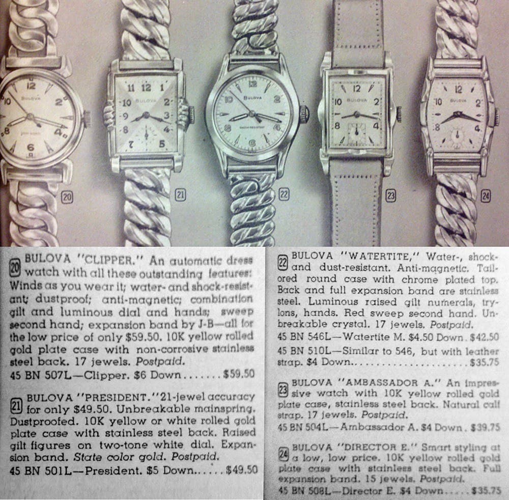 Мужские винтажные часы Bulova Director A. По моей оценке, 1954 год выпуска (прикладываю фото из каталога 1954 года, где изображены эти часы с таким корпусом и циферблатом, модификация Ambassador, также для примера каталог 1959, где изменен шрифт цифр).