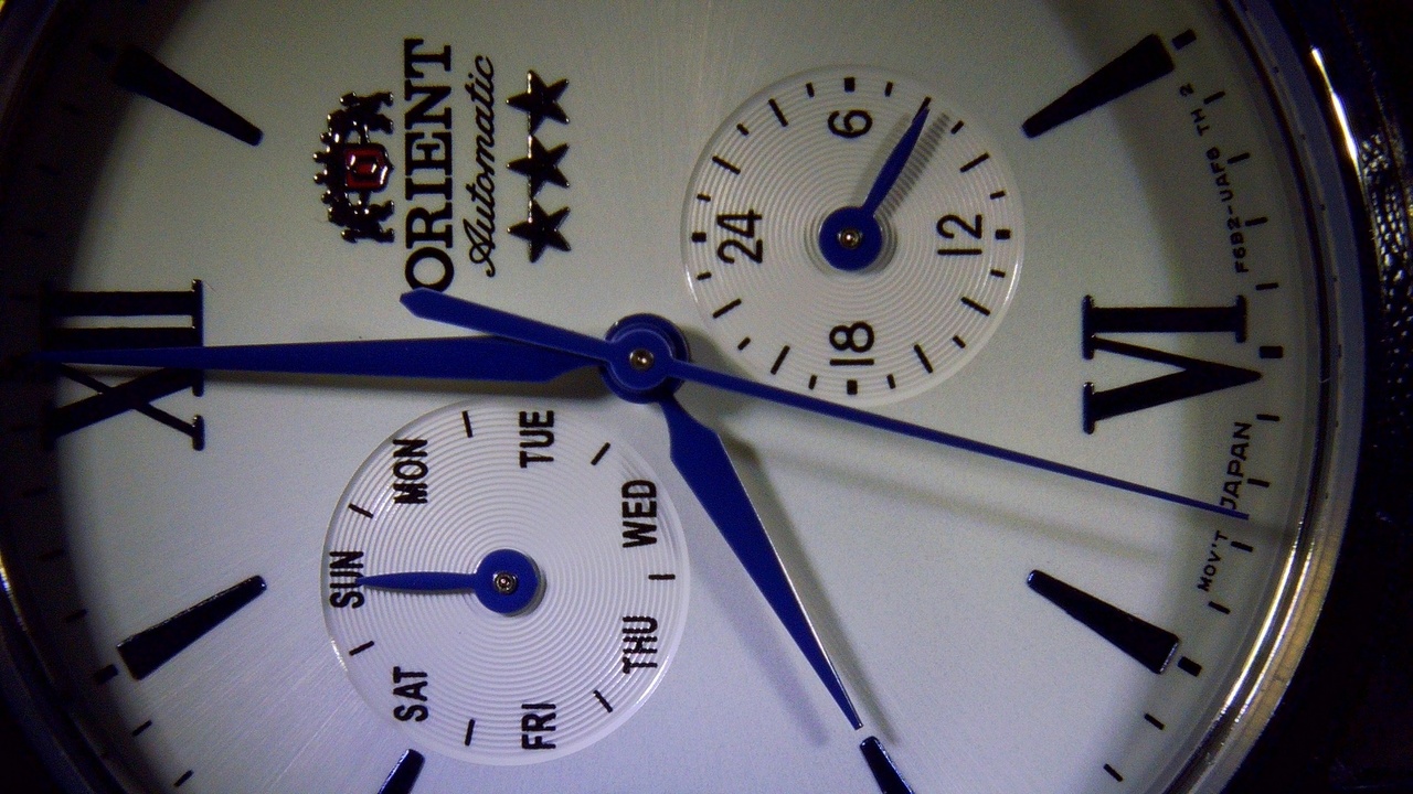 Теперь собственно о часах … Никогда не верьте фотографиям. Бюджетную модель никто не будет красиво фотографировать, выделяя достоинства. Циферблат у Orient Altair сбалансированый и время легко читается. Четкая часовая и минутная разметки. Часовая разметка и римские цифры слегка выпуклые - сомневаюсь, что они накладные из металла, скорее это аппликация, но смотрится здорово! Стрелки точно под цвет “накладных” меток. Секундная и минутная стрелки правильной длины и касаются минутных меток. На минутной и часовой стрелках нет хвостов-противовесов, они тонкие и субциферблаты всегда видны … Думаю такими и должны быть стрелки на часах с ретроградными указателями. На Дефендере стрелки слишком “жирные”! Белое окошко даты как бы является продолжением римской тройки и практически теряется на циферблате, но, когда надо, быстро находиться! Субциферблат дня недели немного больше чем субциферблат 24 ч и это хорошо! Субциферблаты фрезерованы концентрическими окружностями, разметка их контрастная и читается так же легко, когда это нужно! Если говорить о цвете циферблата, то он не белый! Я бы определили цвет как “очень светло-бежевый металик”. Смотрите фото я постарался передать цвет циферблата настроив цветовую температуру в фотокамере.