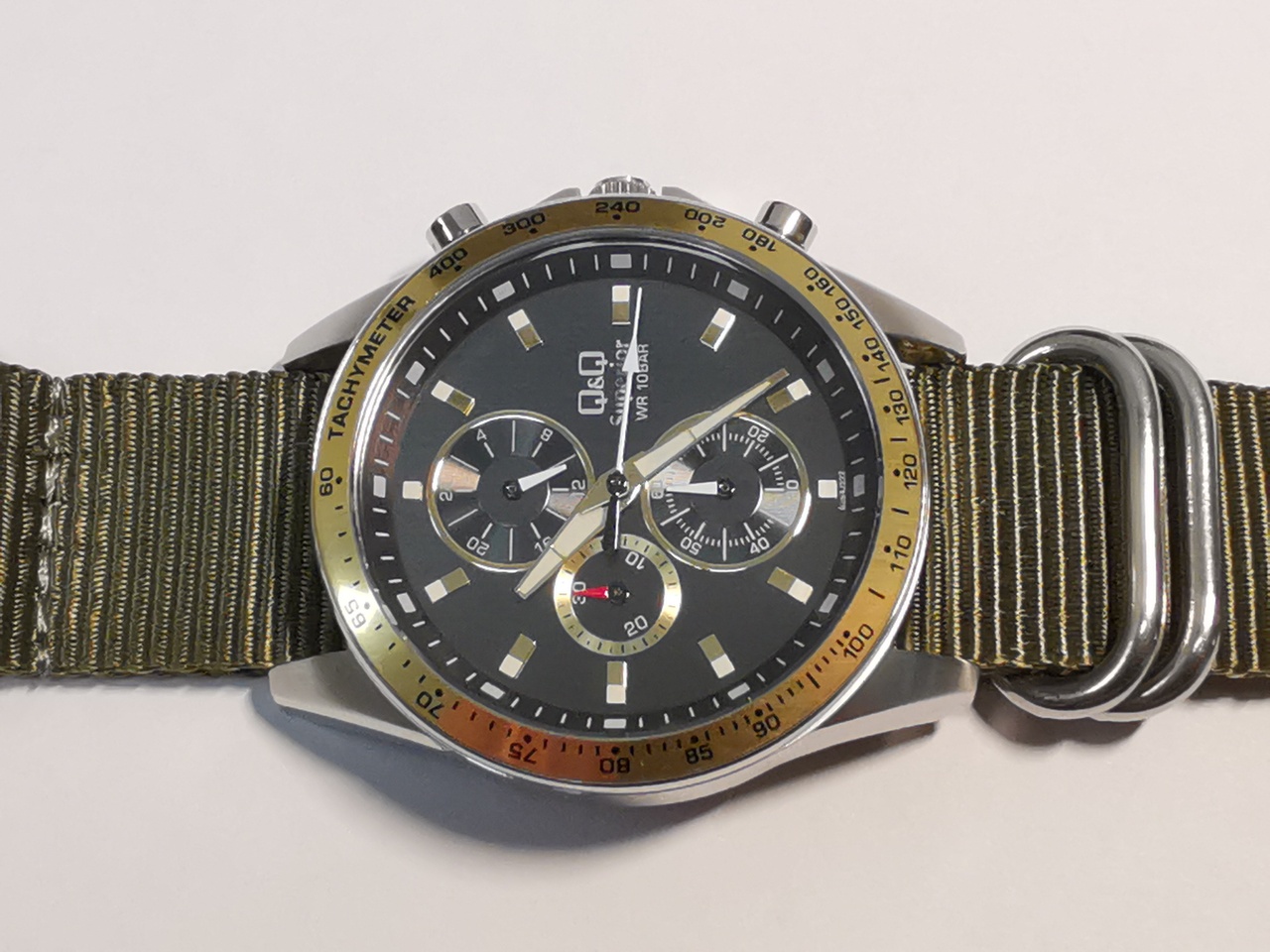 Установленный на часах недорогой браслет имеет штампованные концевые звенья. Браслет выполнен хоть и простенько, но без острых кромок. Я попытался разобрать звенья, чтобы укоротить его, но, шпильки так просто не собирались сдаваться. Тогда я решил с браслетом не бороться, а просто избавиться от него, что и сделал. У меня среди ремешков нашелся зеленый Натовский, который как нельзя лучше вписался в облик часов. Хоть, я и не люблю подобные ремешки, но в данном случае часы сели на руку комфортно,- решил так и оставить.
