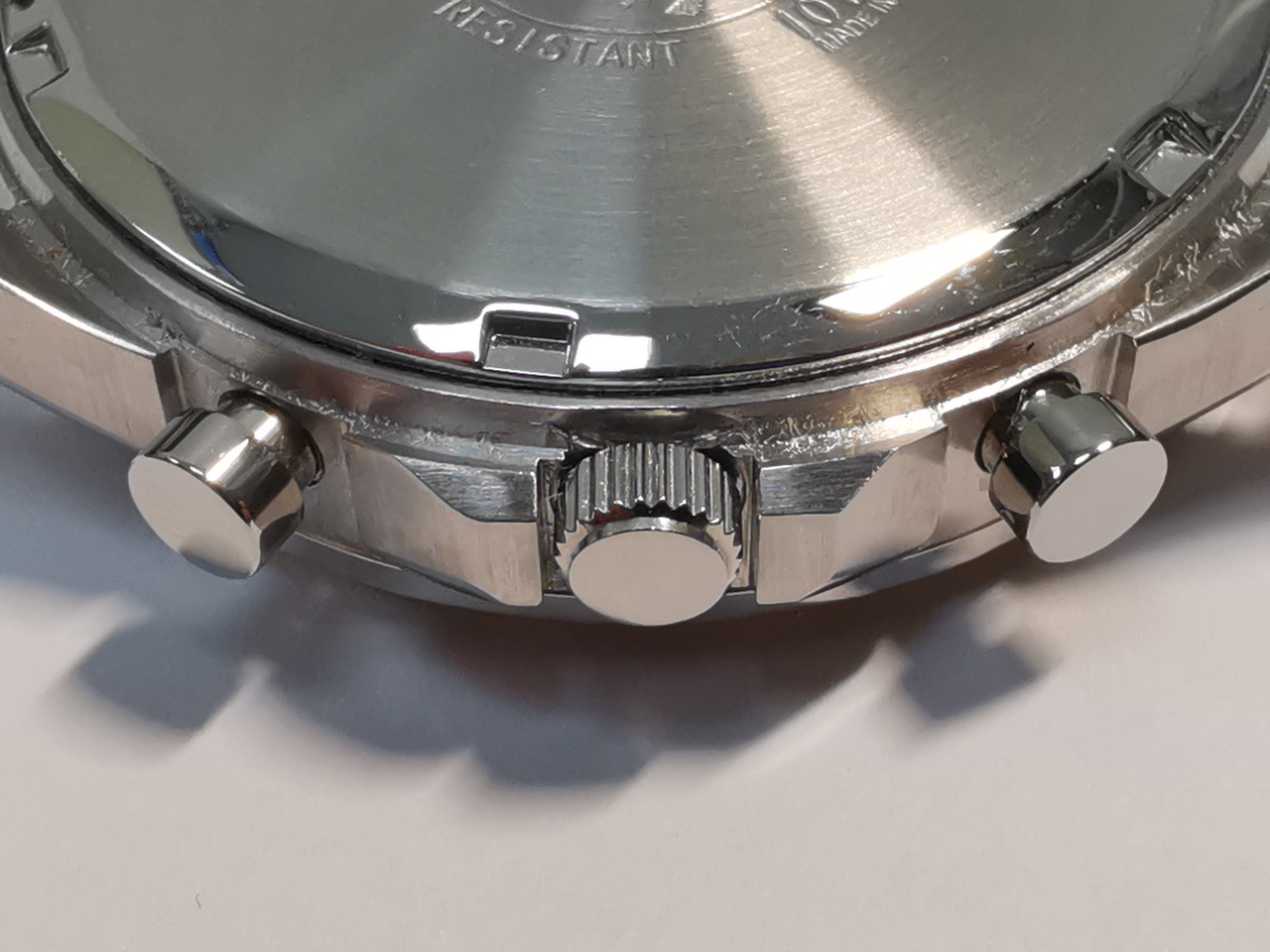 Заводная головка без резьбы, управляет только переводом стрелок. Верхняя кнопка запускает хронограф, нижняя - обнуляет его.
