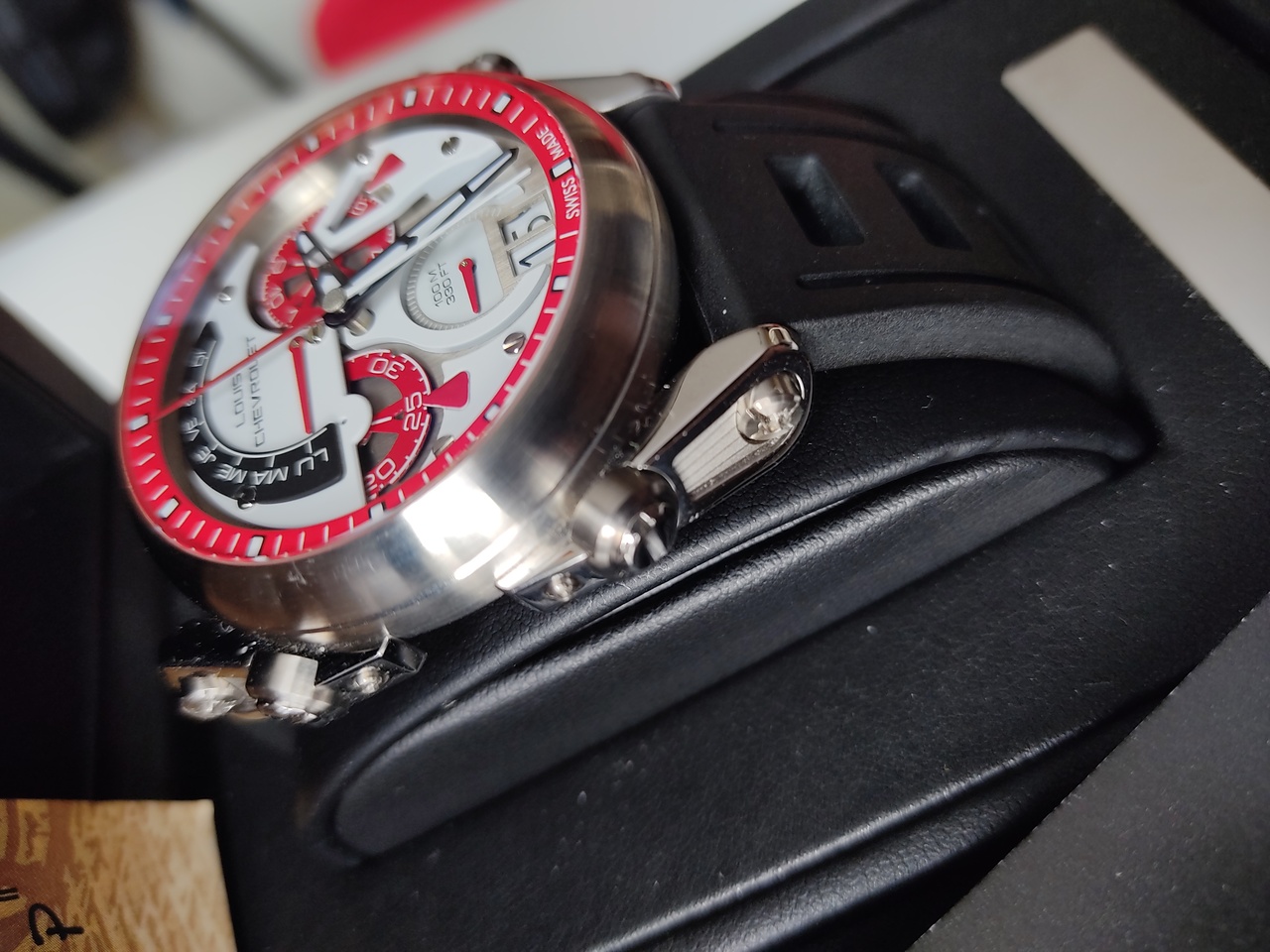 Лимитированная версия N5 из 99 экз. Хронограф. 8040.N Ronda Quartz. Крупные часы, 44мм, без ЗГ, интересный многоуровневый циферблат с усложнениями (крутятся диски, а не стрелки и др). Выпуклый сапфир с антибликом. Украшения на дужках, ЗГ и прочие нюансы. Богатая коробка, буклеты+ каучук+ белый ремешок 24мм. На офсайте есть видео обычной версии.