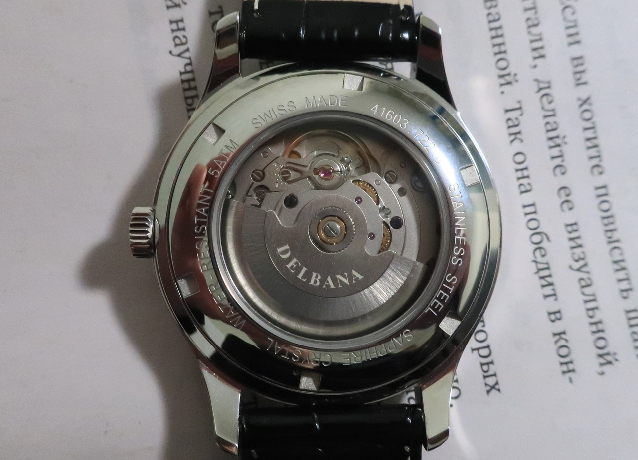 Вид сзади тоже намекает на бюджетность. Механизм Sellita SW200 — не декорирован, стекло в задней крышке — минеральное, ротор автоподзавода — кастомизирован всего лишь мелкой гравировкой Delbana (даже не фирменным шрифтом, и это в юбилейной-то модели). Однако кто, кроме вас самих, будет рассматривать заднюю сторону ваших часов и проверять тип стекла в ней?