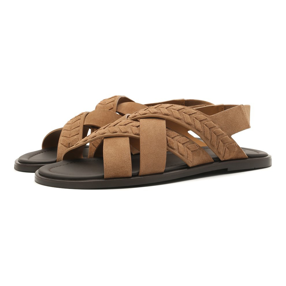 "Светло-коричневые сандалии с гибкой подошвой и ремешком с эластичной резинкой будут незаменимы в жаркую погоду. Легкая обувь, для создания которой дизайнеры Джорджио Армани выбрали широкие ленты бархатистой мягкой замши, украшена шевронным узором."