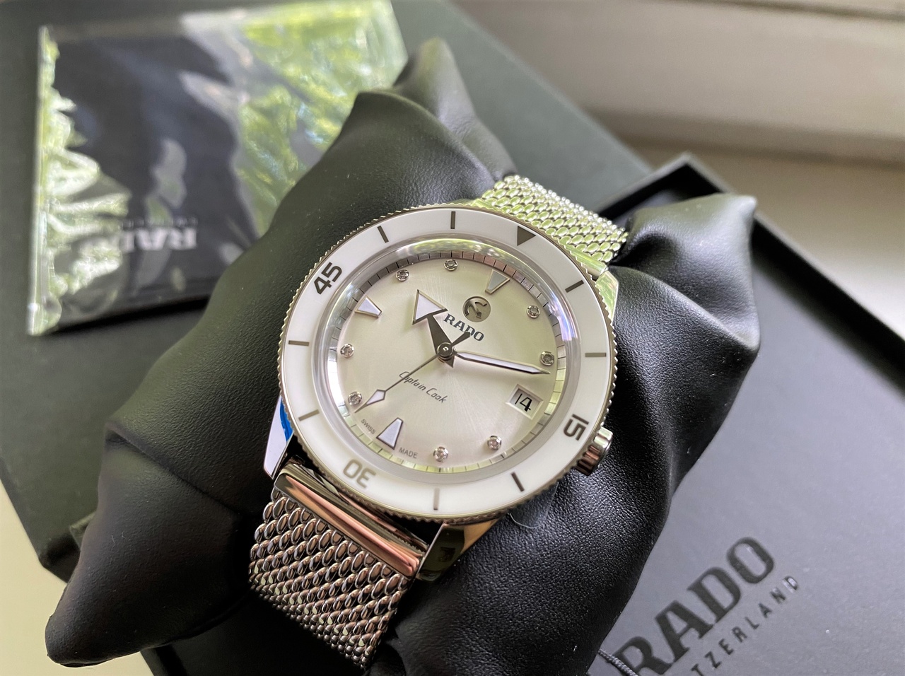 Светло-серый циферблат, украшен бриллиантами, керамический безель, прекрасный миланский браслет,