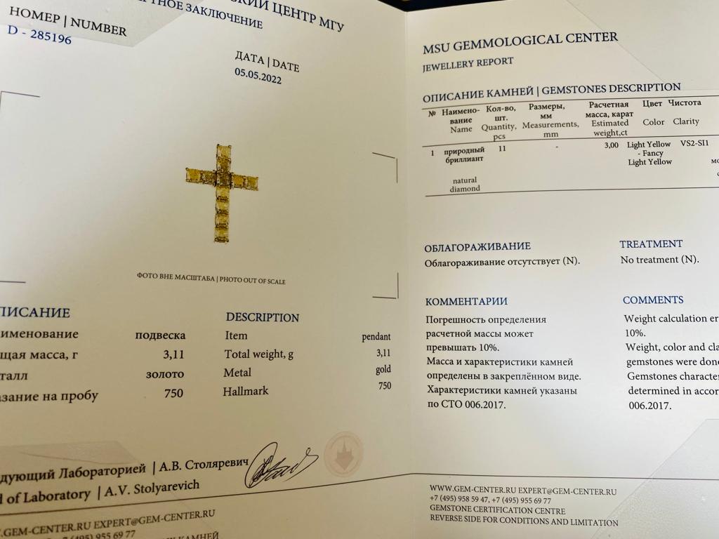 ПОДВЕСКА КРЕСТ С БРИЛЛИАНТАМИ Fancy, 3 карата (сертификат МГУ)!