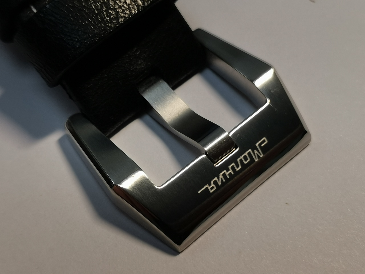 Бакля установленная на ремешке, - как на кожаном, так и на силиконовом – внешне напоминает панераевскую. Однако, некоторый «надлом» заметный при виде сбоку, говорит о специально задуманном отличитильном визуальном эффекте. Основание бакли массивное, литое, со следами сатинирования и полировки. На внешней стороне бакли имеется гравированный логотип-слово «Молния».