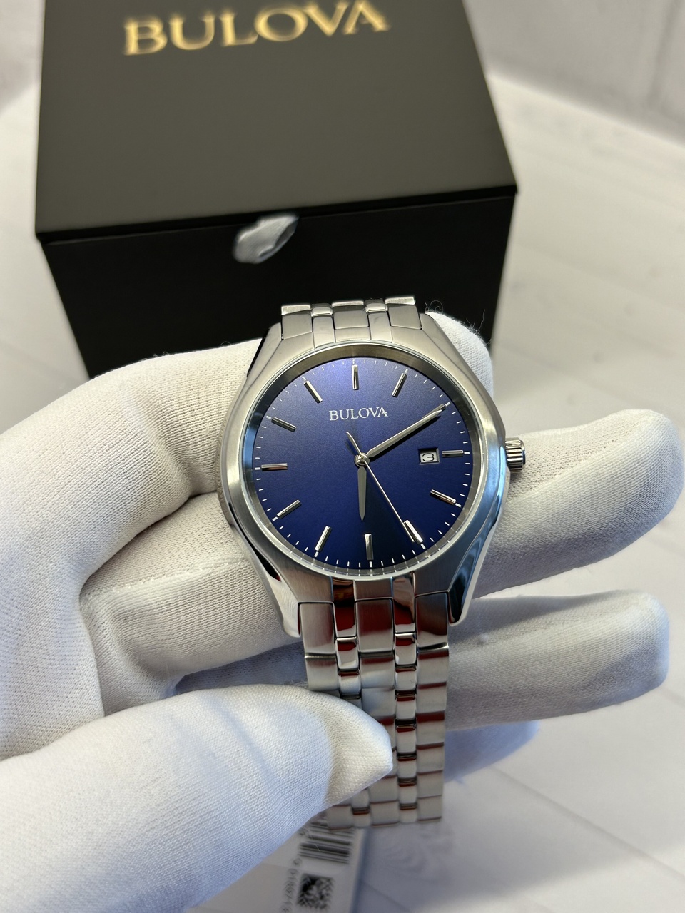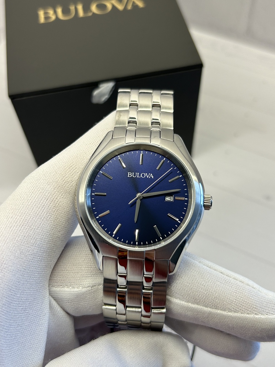 Циферблат: синий, с серебристыми стрелками и часовыми метками