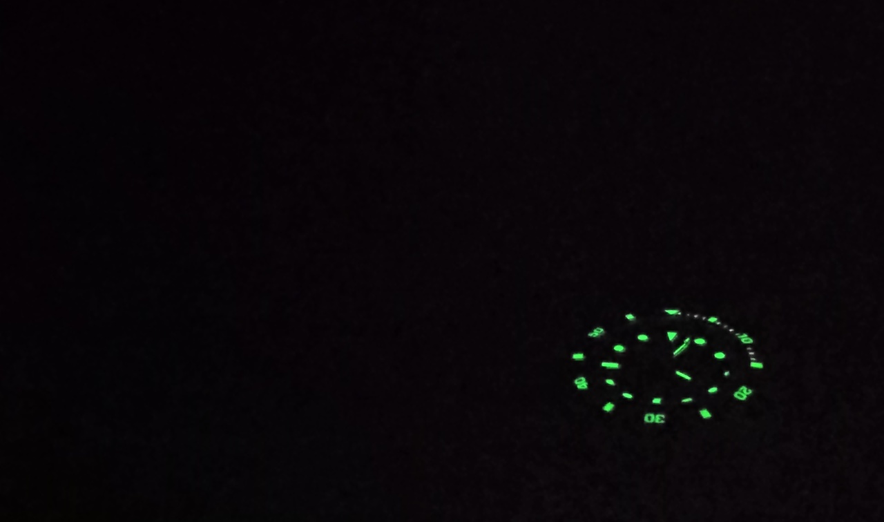 Дизайн циферблата достаточно классический в Саб-стиле. Но метки не накладные, а вырезанные. В их глубине негасимо светитятся винтажным жёлто-зелёным светом тригалайты. Циферблат матовый чёрный, триголайты глянцевые чуть бликуюшие. Стекло почти плоское снаружи, имеет закруглённую внутреннюю поверхность с синеватым антибликом. Всё это дополняется «рояльным» отливом сапфирового безеля с тритиевой сэндвич подсветкой. Это я к чему?.. К тому, что смотрится немного винтажно и дорого. На мой взгляд, выходит такой fifty fathoms стиль, но с разметкой от Саба, и сэндвичем от Пама. Всё лучшее собрали.