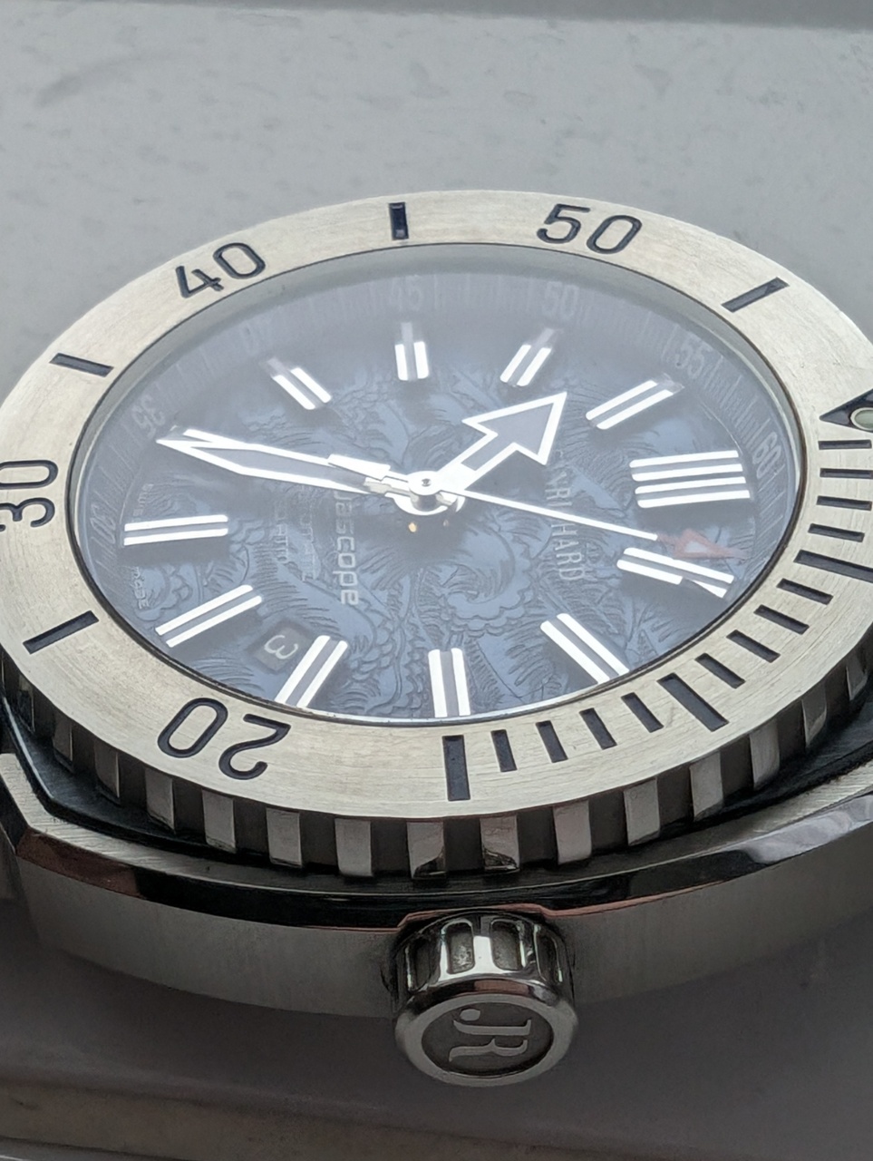 Безель дайверский, с разметкой, сатинированный, односторонний, с хорошо чувствующимися щелчками. Очень хороший люм, светится голубоватым цветом, причем при небольших сумерках. Задняя крышка завинчивающаяся, с логотипом JR. Полный комплект - Коробка, кожаный чехол для часов, плечевой ремень для чехла, гарантийная карточка, бирки.Дополнительный ремешок hand made.