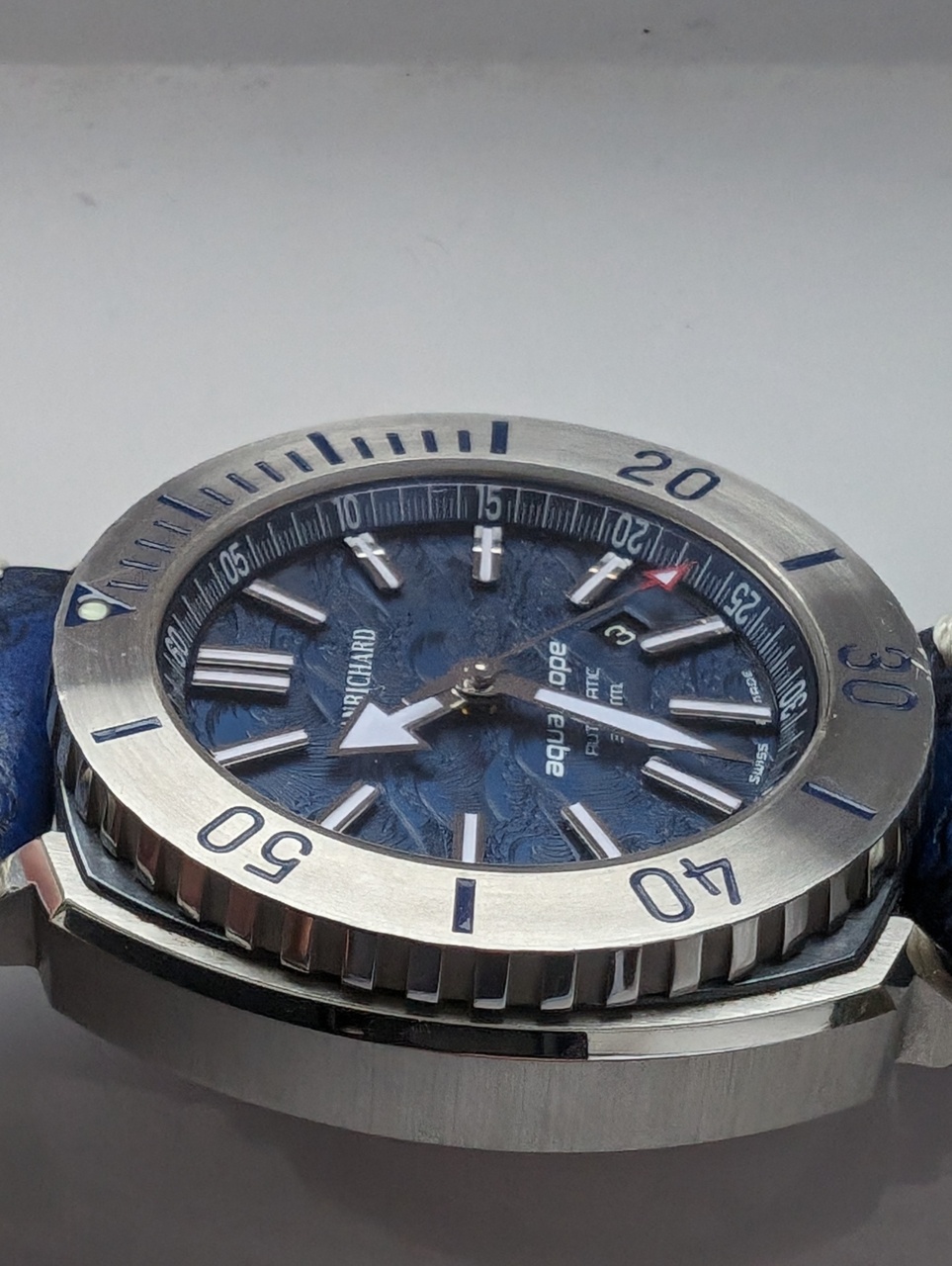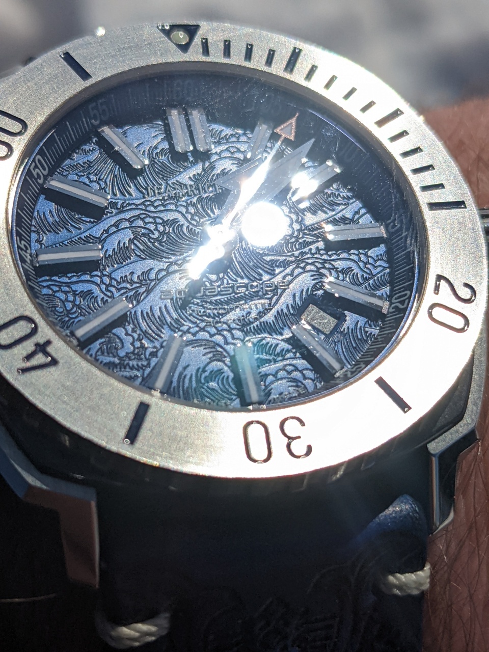 Циферлат - с гравированным рисунком в виде волны с картины японского художника Хокусая "Великая волна у Каганавы" Цвет цифера меняется в зависимости он падающего света, на цифере накладные парящие часовые метки с люминесцентными элементами. Считываемость времени просто отличное, все очень контрастно, на цифере ничего лишнего.