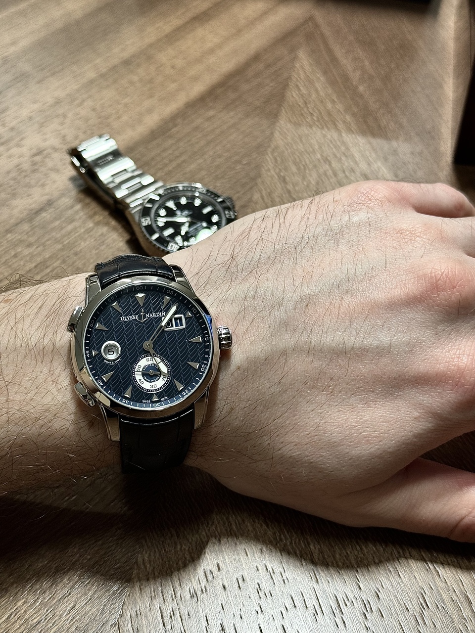 Шикарный мануфактурный калибр UN-334. Запас хода 48 часов. Большая дата. Окошко 24-часового прыгающего указателя времени второго часового пояса.