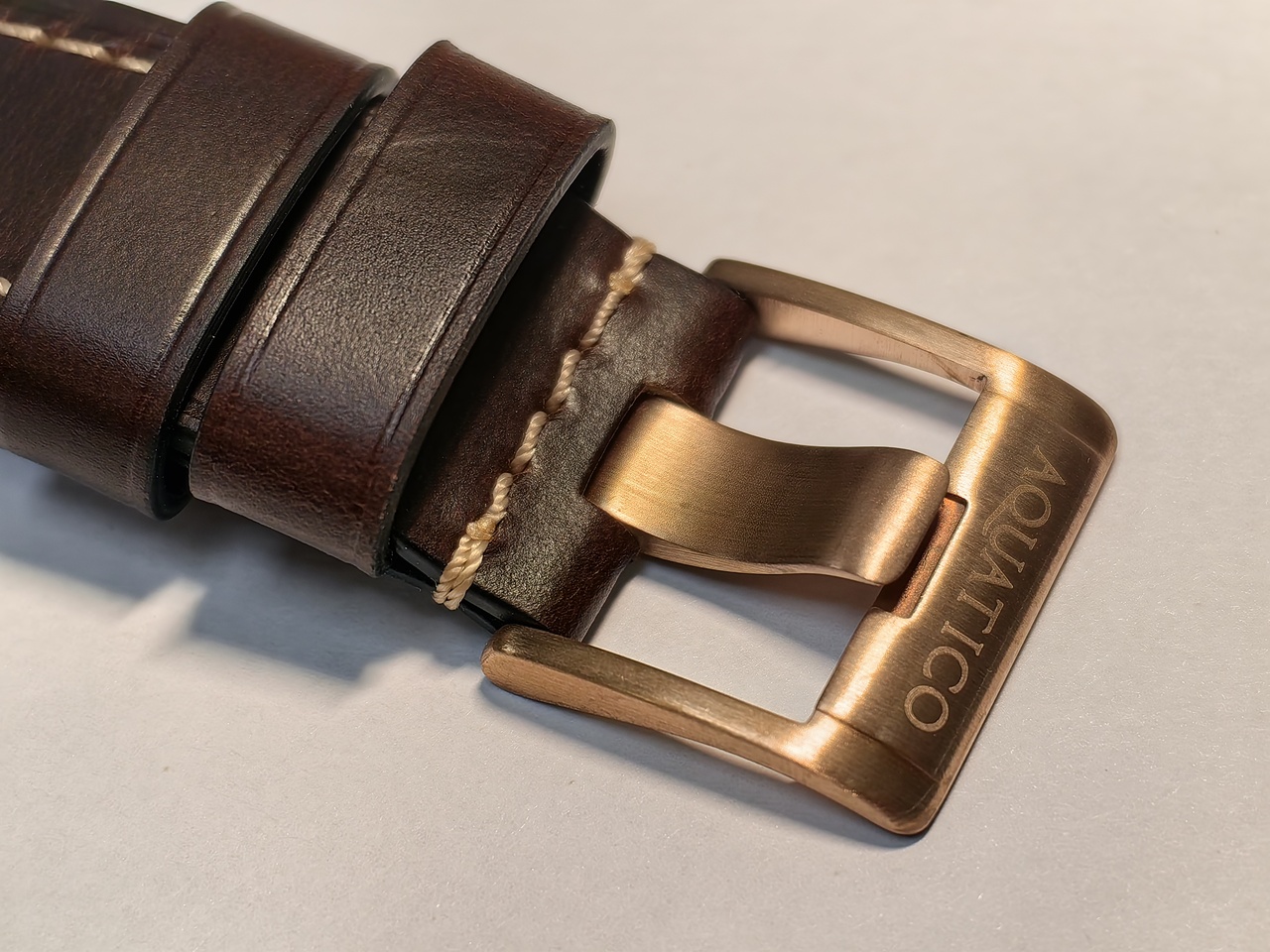 Ремешок кожаный, изготовлен из двух слоев,- нижний черный текстурный, верхний – гладкая полуматовая кожа темно коричневого цвета. Края ремешка обработаны специальным полимерным составом. Ремешок прошит по периметру нитками бежевого цвета. Бакля ремешка массивная, бронзовая, с прямыми сторонами. На лицевой стороне неглубоко выгравирована надпись Aquatico. Бакля со всех сторон браширована, острых углов нет, они как будто зализаны.