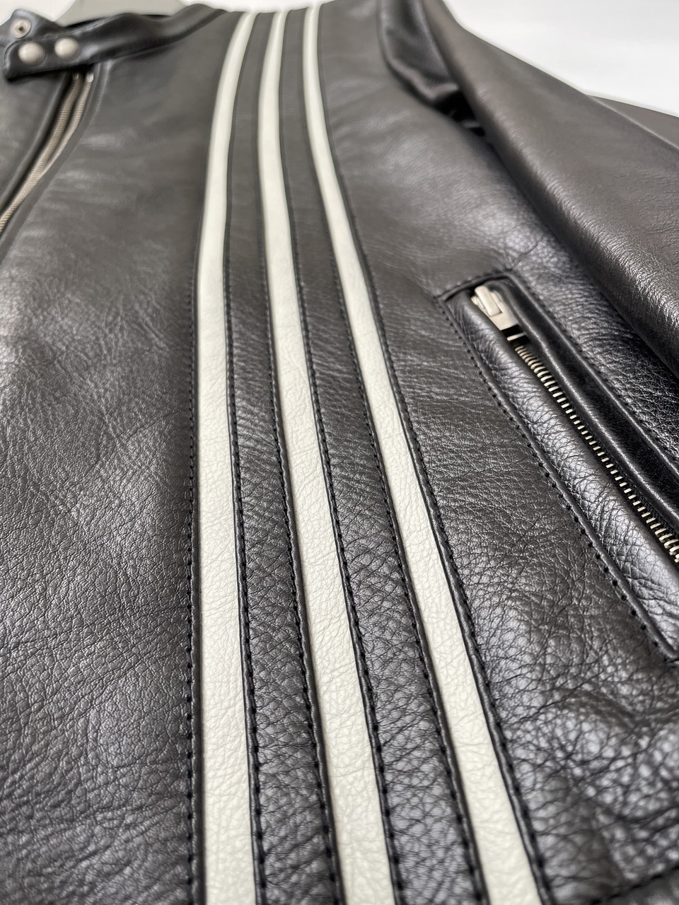 Куртка изготовлена из плотной бычьей кожи,классического чёрного цвета.Изделие дополнено контрастной отделкой в виде тонких полос белого цвета,придавая спортивный стиль.Застёжка на плотную металлическую молнию с двумя крупными бегунками с названием бренда.