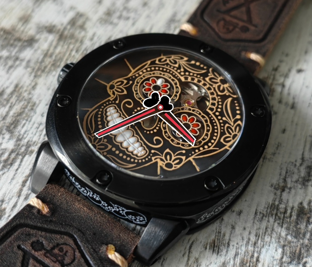 Но, самым лучшим дизайнерским решением, я считаю - применение в данной модели механизма Miyota 82s7. Это механизм с открытым балансом, имеющий две малых стрелки, одна из которых секундная, другая показывает время в 24х часовом формате. У многих производителей часов (Bulova, Armani, Lobinni, Reef Tiger и прочие) использовавших этот механизм, в итоге получался плохо читаемый циферблат. Не исключение и эти часы,- вряд ли на малых циферблатах удастся с уверенностью зафиксировать определенные отрезки времени. Однако, дизайнерское решение о переносе заводной головки на левую сторону корпуса, позволило использовать малые циферблаты в качестве глаз доминирующего изображения. (таким образом можно изготовить серию серию моделей с разными изображениями) Вместо стрелок на малых циферблатах установлены миниатюрные "цветочки", которые двигаются согласно скорости механизма. Особенно оживляет изображение на циферблате левый глаз, цветочек в котором находится в постоянном движении. Открытый баланс прямо на "лбу" черепа, если не украшает, то по крайней мере добавляет немного стимпанка в общую картину. В целом облик часов говорит о том, что они наиболее уместно будут смотреться на тематических вечеринках, походах в кафе и детских праздниках, то есть для не очень серьёзных, "атмосферных" выходах в свет.