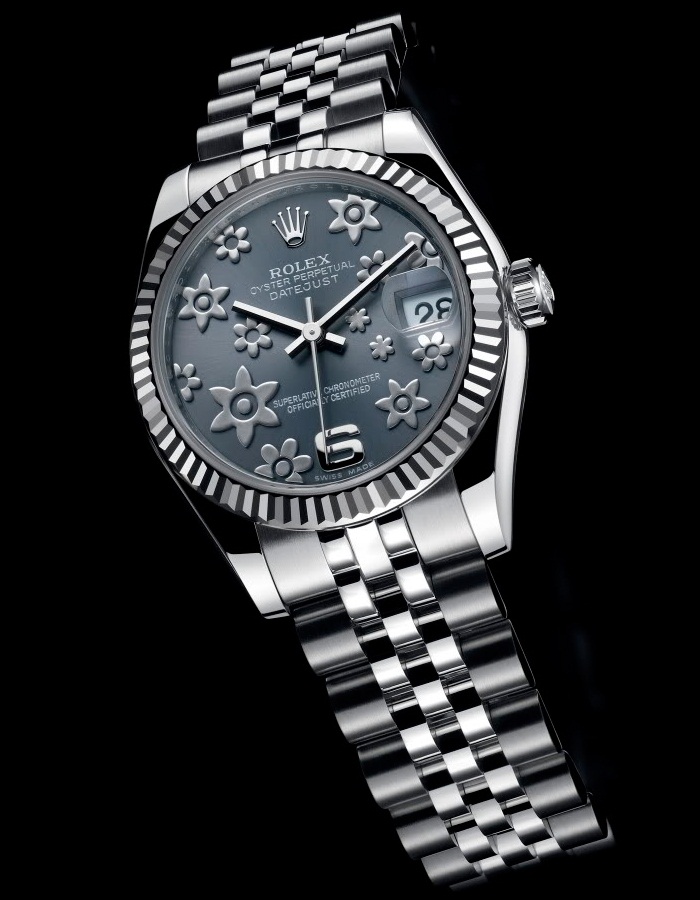 Rolex Perpetual Datejust Lady 31mm – автоматические часы в корпусе из белого золота со стальным браслетом. Флористические элементы декора на черном родированном циферблате несколько смягчают холодный характер хронометра. Водостойкость – 100 м, резерв хода – 48 часов, большой указатель даты.