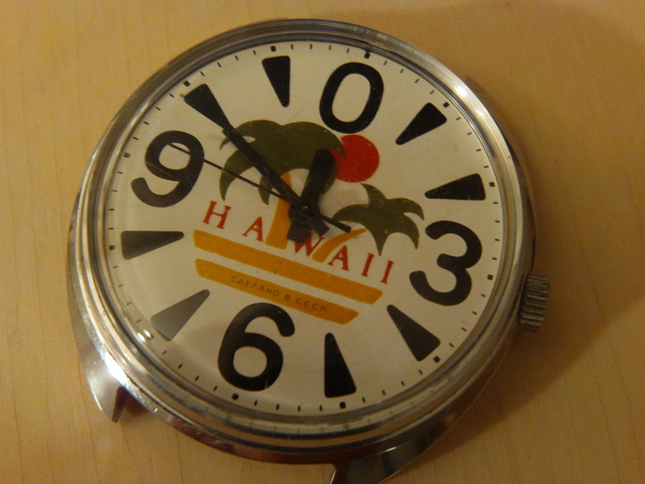 интересно что рисунок на циферблатте для плохо видящих... Гавайи по английски, а сделано в СССР по русски. Вот такой интересный цифер.