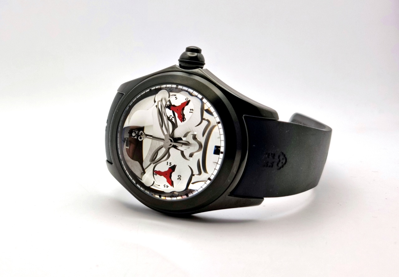 Соrum Вubblе 47 Сhrоnоgrарh LЕ 88. Лимитированная серия из 88 экземпляров. Прочный и долговечный круглый титановый корпус с РVD покрытием чёрного цвета. Сложный циферблат с различными декоративными элементами оформлен в стиле "おに Оni Моnstеr Маsk" - маски монстра, которую использовали самураи. Ажурные центральные стрелки с покрытием родием и финишной шлифовкой, дополнительные стрелки красного цвета в виде самурайских дротиков. Окошко даты находится в положении 6 часов. Прозрачная задняя крышка с сапфировым стеклом, через которое можно наблюдать работу механизма часов и ротора автоподзавода с черным финишным покрытием. Удобный каучуковый ремешок с тиснением и классической литой застежкой.
