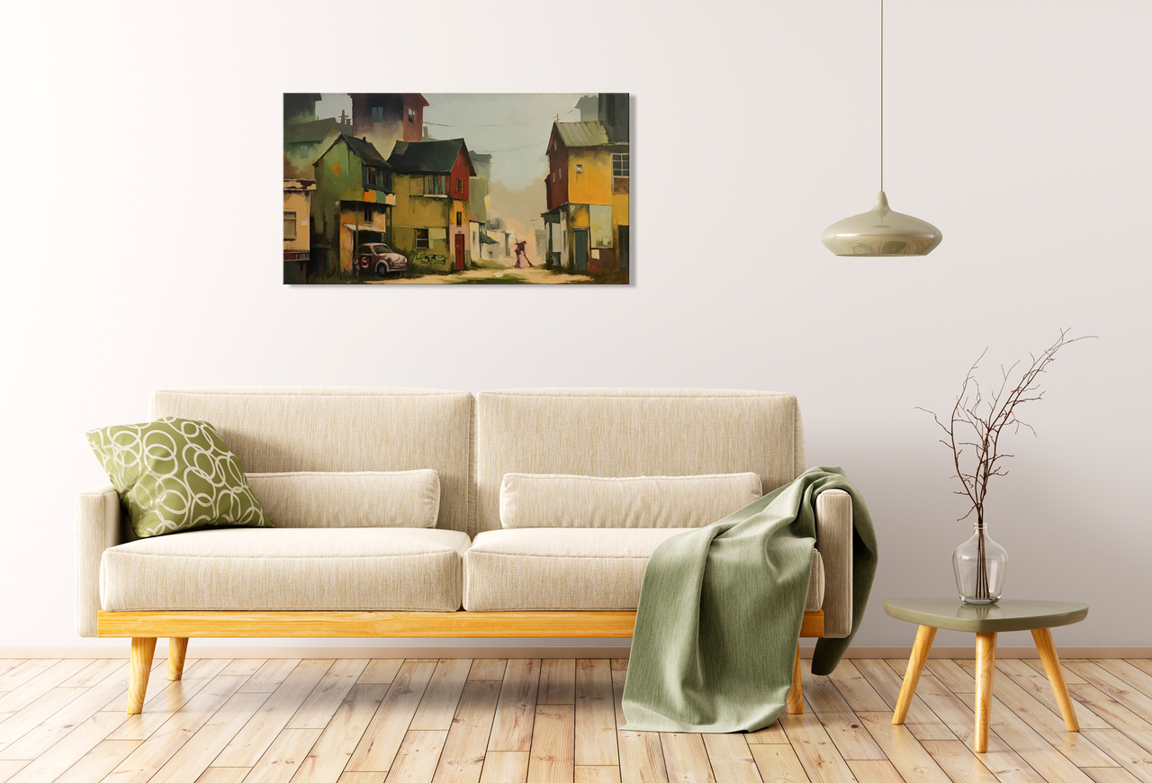 Картина рассказывает историю места, живущего по своим законам. Среди домов с заколоченными окнами и потускневшими фасадами сохраняется особая жизнь — человек с метлой, автомобиль со спортивной историей, тихая непритязательная красота обычного дня.