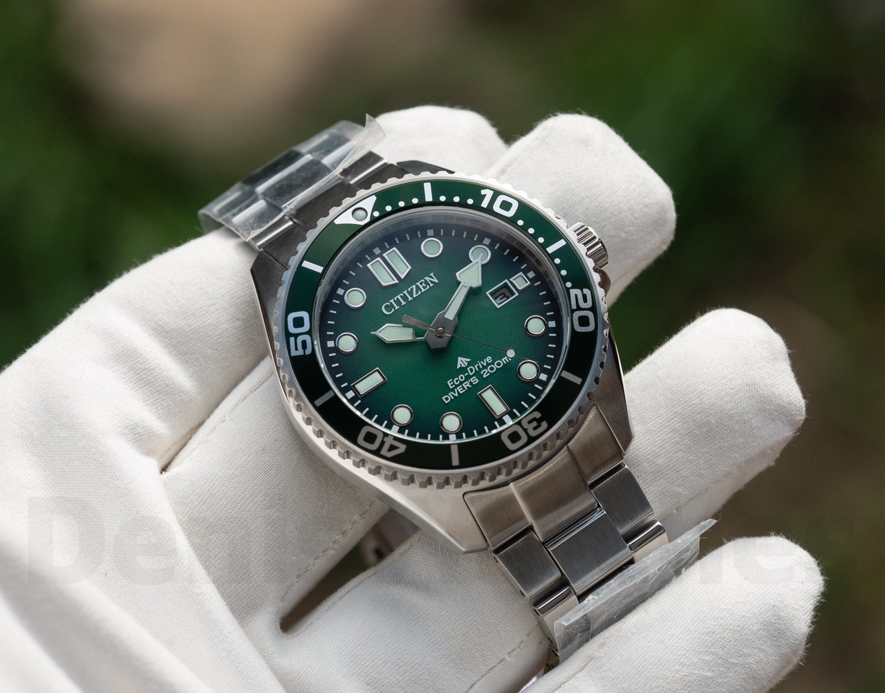 Эко-драйв, сапфир, сталь, 41мм диаметр с потрясающей эргономикой корпуса и общей массой всего 150 грамм на литом браслете с дайверским расширением, хваткий алюминиевый безель на 60 кликов выступает на 0.5мм выше уровня плоского стекла над циферблатом, крупная заводная головка с защитным выступами и очень плавным ходом резьбы, отличный люм зелёного цвета, красивый синий циферблат с накладными метками - и все это за цену около 500 канадских долларов (порядка 370 американских) за свежую новинку у официальных дилеров Ситизен с витрины в Канаде и гарантией 5 лет!