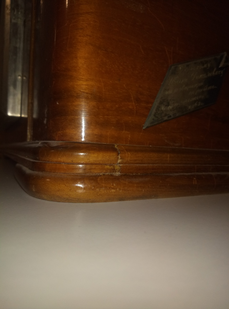 Сохранность собственно предмета, его родословная через сохранившиеся документы, включая квитанции на ремонт с 1978 по 2005 годы- тому подтверждение. И это прекрасно, когда подобная вещь не уехала к передовику сельского хозяйства в колхоз, а попала в должные руки, ценилась и была сохранена до наших дней.