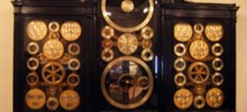 Географическая же часть состоит из 37 циферблатов, некогда показывавших поясное время для 37 городов Европы, Азии, Африки, Северной и Южной Америки и Австралии. Звездное время, солнечное склонение, а также час восхода и захода Солнца, долгота дня и ночи, моменты наступления равноденствия и солнцестояние – еще несколько астрономических величин, которые способны показать эти часы, если когда-нибудь найдется такой часовых дел мастер, который сможет вновь завести их механизм.