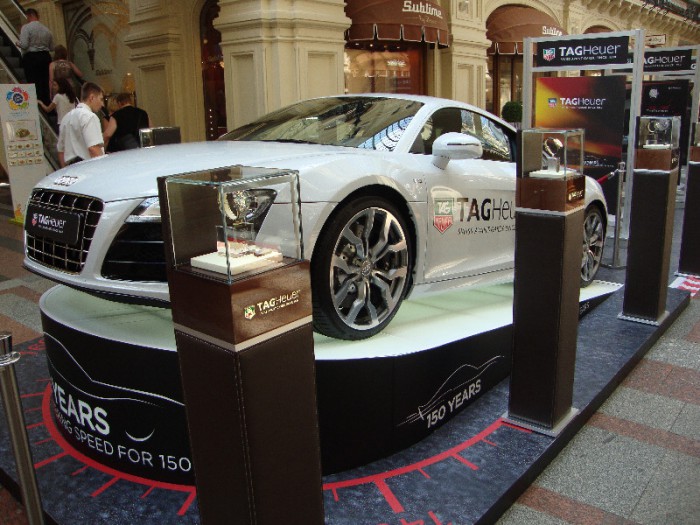 По случаю выставки в ГУМе выставлена эксклюзивная модель AUDI R8, чествующая 150-летний юбилей служения TAG Heuer идее покорения точности и высоких скоростей. В роскошном Audi R8 V10 сосредоточены все инженерные находки, накопленные за годы побед Audi на гонках в Ле-Мане. Атмосферный двигатель модели – компиляция технологий, используемых в гоночных автомобилях: таких как система смазки с сухим картером и технология непосредственного впрыска топлива FSI. Огромная мощь, потрясающая динамика разгона, ассоциирующаяся с освобождением колоссального запаса энергии, завораживающий звук двигателя… Все эти впечатления сливаются в чувство восторга от управления настоящим спортивным болидом.