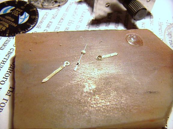 Ножку циферблата я приделал. Давно уже, в этой ветке, меня надоумили как их изготавливать. На фотографии показаны заготовки этих ножек, которые я сам паял на работе, под любопытные взгляды инженеров Когда они поинтересовались, что это, я честно ответил  ножки Они завистливо переглянулись - «Видать хороший вчера был ганджубас! До сих пор парня колбасит!» На следующем фото, ножка готовая к приклеиванию.