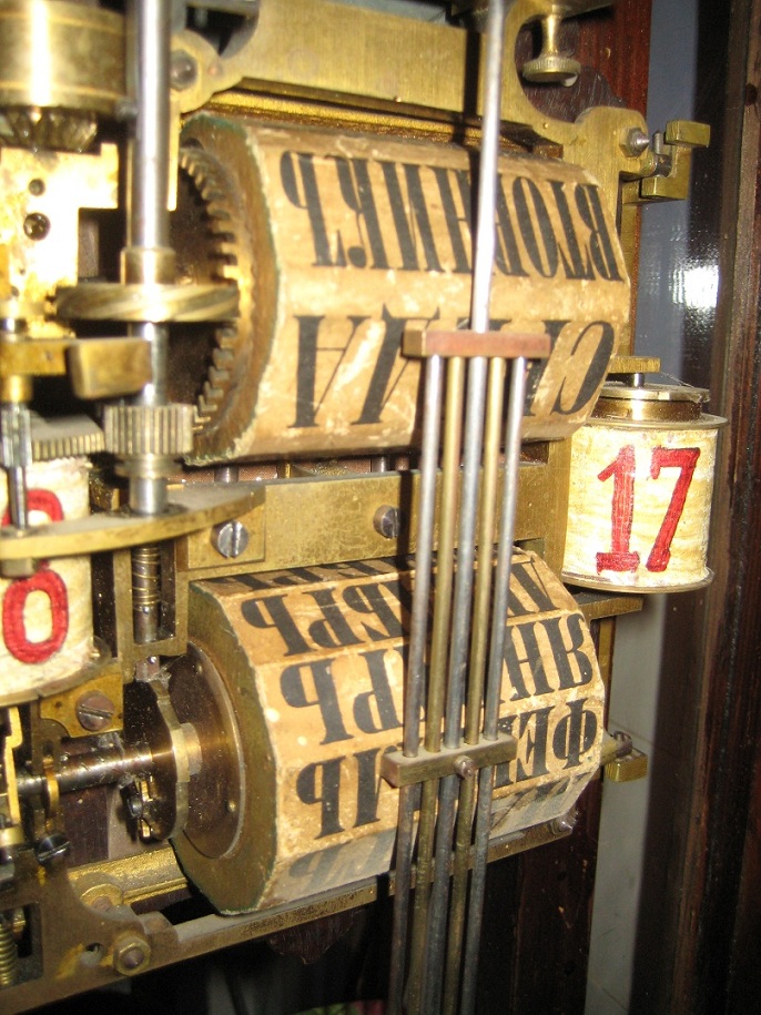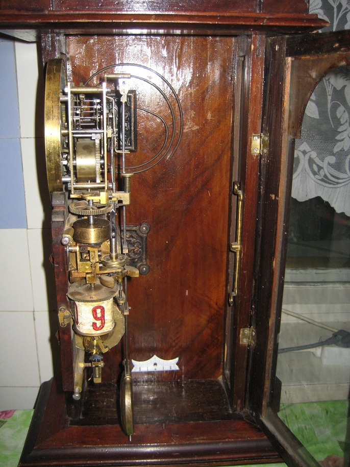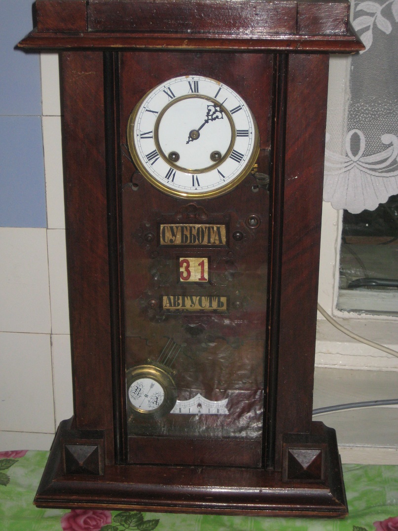 Это немецкие стенные часы с дополнительным автоматическим календарным механизмом. Такие часы изготавливались в Германии несколькими фирмами, но патент на изобретение принадлежал фирме Братьев Вильде (Gebruder Wilde) в городе Виллинген (Villingen) с 1874 года. Вот тут мы обсуждали похожие часы: