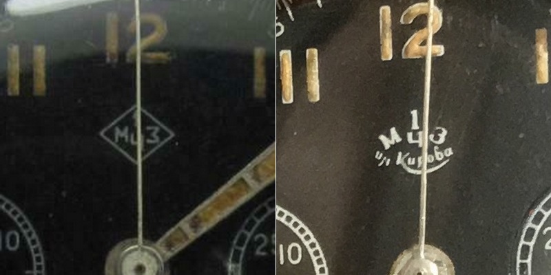 Логотипы на циферблате были двух видов: ранний «1МЧЗ» в ромбе и поздний «1МЧЗ им. Кирова».