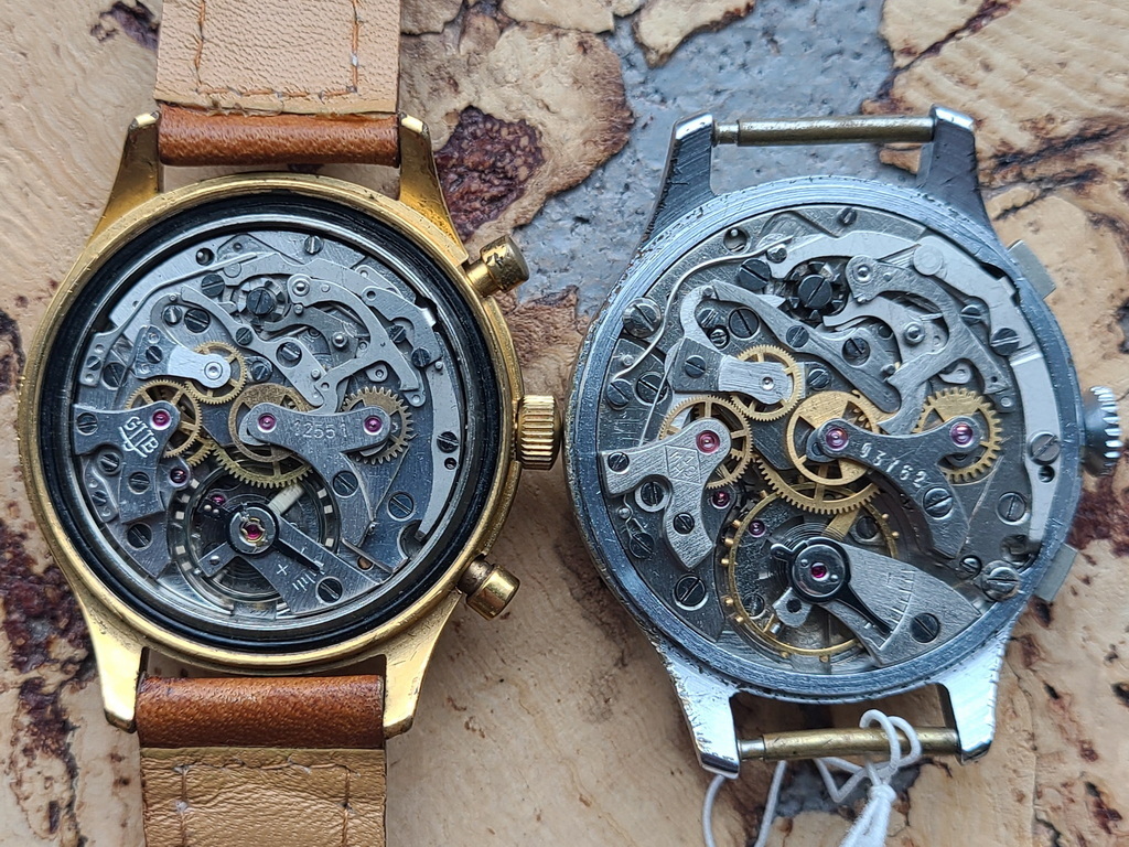 На фото ниже часы на GUB Kaliber 64 (слева) и на UROFA 59 1МЧЗ (справа). Явно видно различие в размерах механизмов при идентичности компоновки, устройства и кинематической схемы.