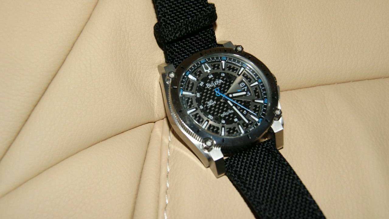 Прогрессирующая часовая болезнь, заставляет покупать всё новые игрушки. Очередными часами стали Bulova 96B132. Часы весьма внушительных габаритов 46х16. Стекло - минералка, изогнутое. Корпус - титан. За счёт этого и ремешка из ткани кордура, часы непривычно лёгкие. На стрелках и метках нанесен светонакопительный состав, после засветки фонарём очень быстро теряет яркость, впрочем остаточная светимость, хоть и с трудом, ночью позволяет разглядеть время. На Альфекс (фото), люм гораздо лучше. Циферблат - карбон. Имеет эффект объёма. При ярком свете выглядит весьма интересно. Уже заказал соответствующий ремень. Штатный тоже неплох, возможно и водозащитный, хотя я точно этого не знаю, вписывается в общий стиль часов - брутально технократический. Рубленные углы корпуса, шестигранные декоративные винты, безель с рифлением (невращающийся) придают часикам спортивный характер. WR 300 тоже атрибут часов для активного отдыха, правда с данной функцией есть интересная особенность, о которой я рассказываю в своём видеообзоре.
