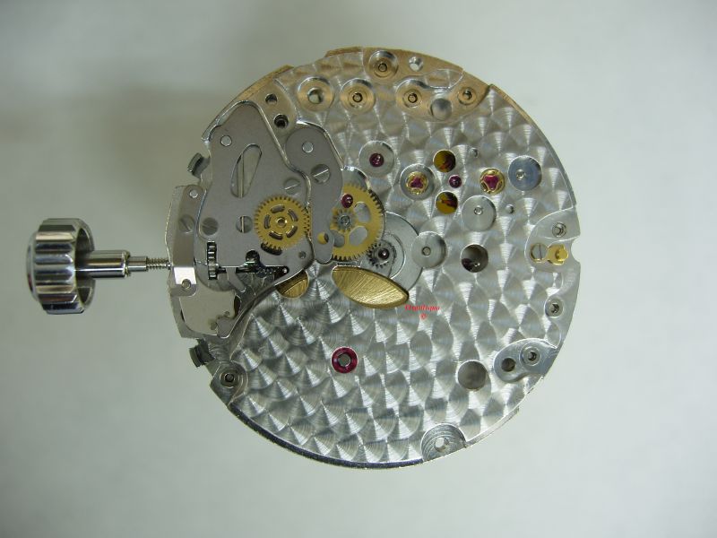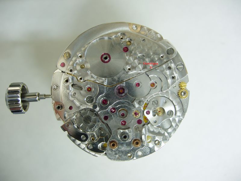 Внизу, в позиции "6 часов" секундное колесо, на его оси сидит маленькая сек. стрелка, обратите внимание на небольшой желтый триб на оси этого колеса - с него идет отбор мощности через промежуточное колесо с вертикальной муфтой сцепления на механизм хронографа.