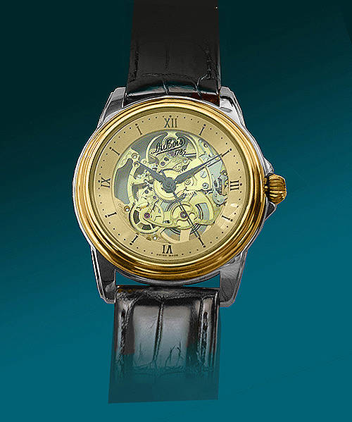 - циферблат прозрачный, позолоченный, с римскими цифрами и метками;