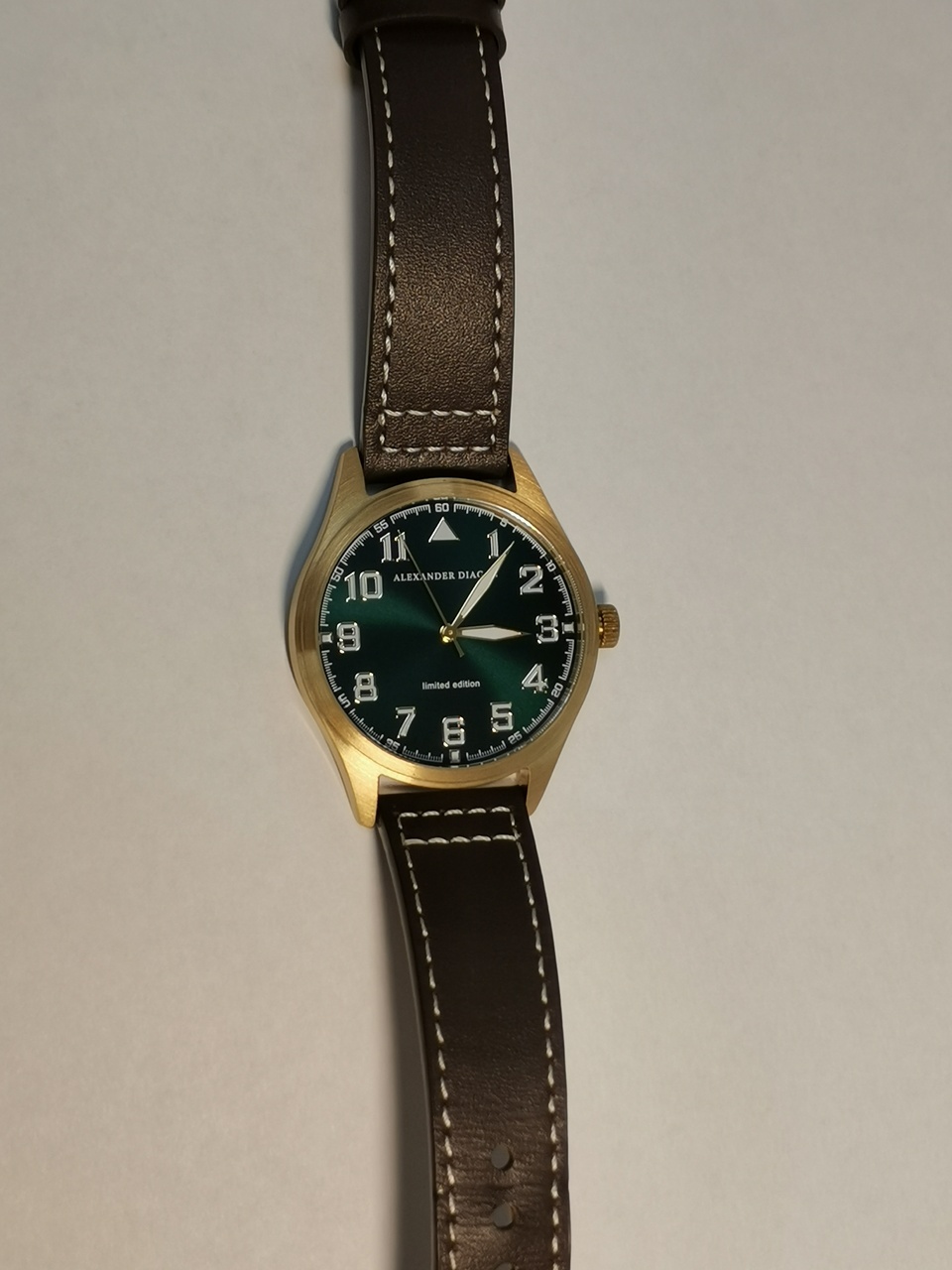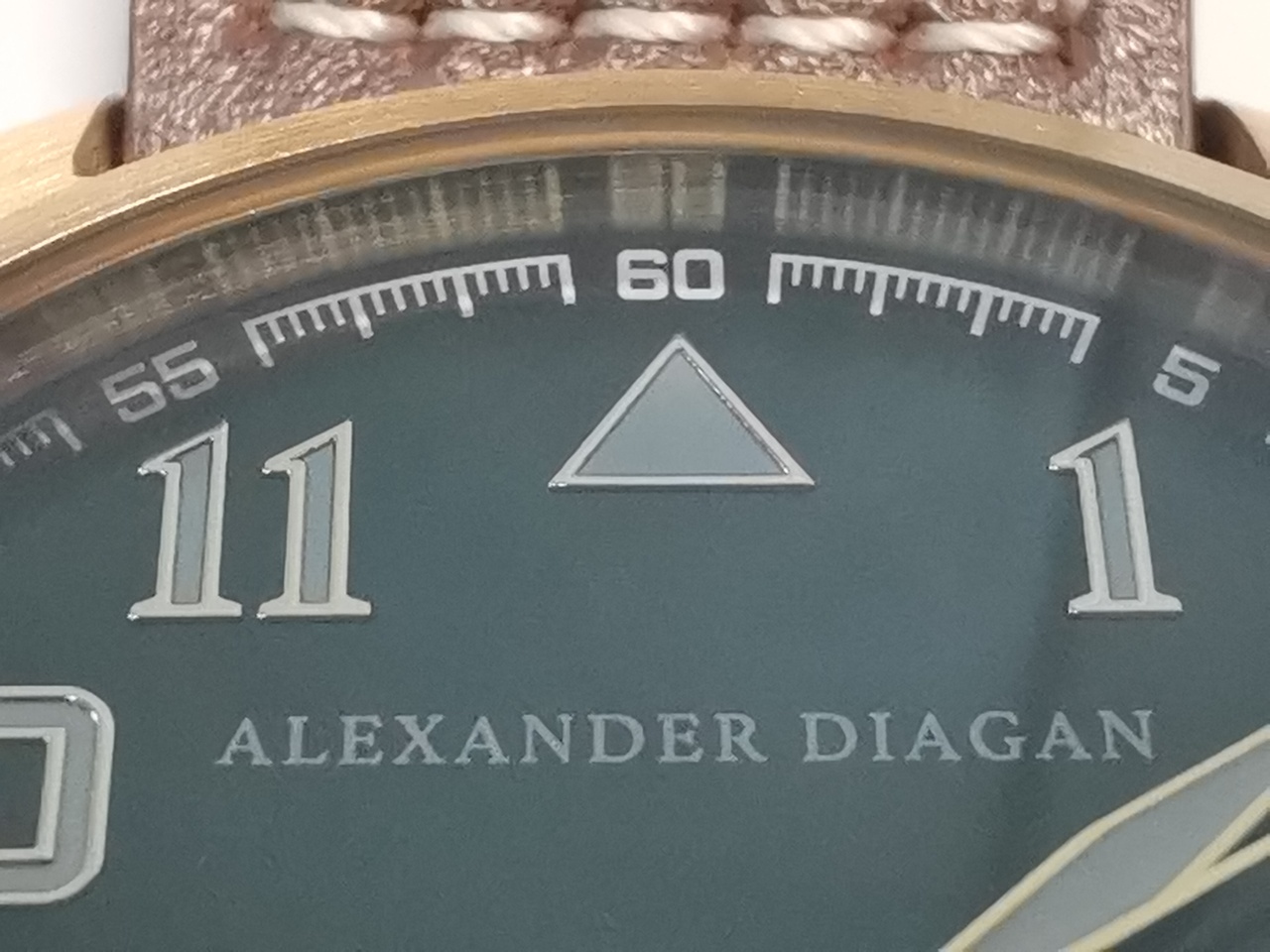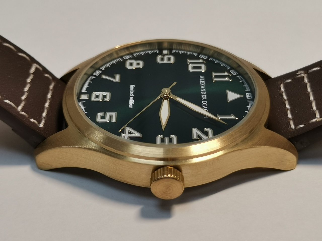 Модель под названием EARTH от российского бренда Alexander Diagan единственная изготовленная из бронзы(на данный момент). Часики на бюджетном кварцевом механизме Мийота, выполнены в стиле пилотов с характерными стрелками и крупными часовыми метками. Производится данный продукт в Китае.
