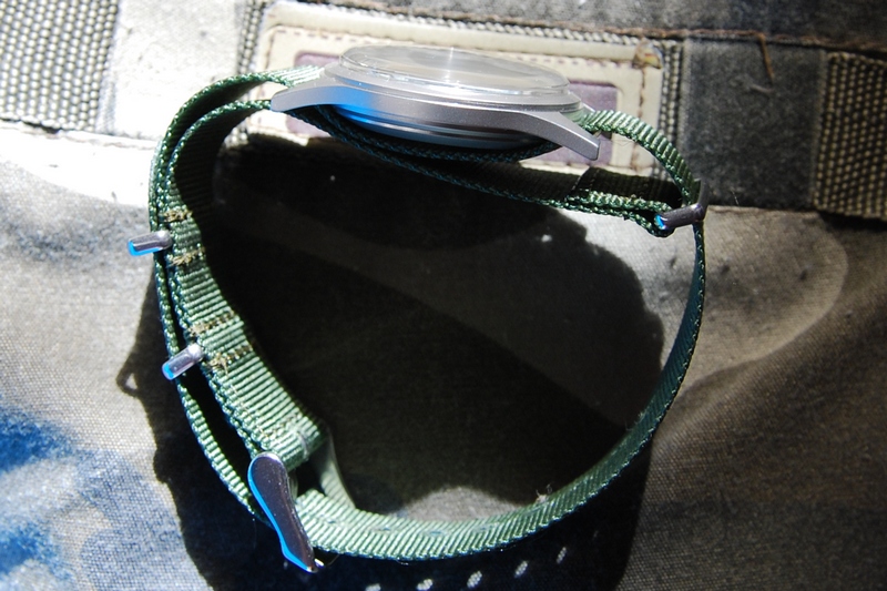 Ремешок текстильный, так называемый "натовский", с интересной системой крепления на часах. Со стороны пряжки ремешок раздваивается; длинный его конец продевается, как обычно, через ушки часов, а затем протягивается через проушину, закреплённую на коротком конце, и уже затем закрепляется в пряжке. Таким образом, часы остаются жестко зафиксированы на ремешке и не сползают по нему. Усмотрел один минус - отверстия для крепления рабочего конца ремешка в пряжке не усилены металлическими обжимными кольцами. Как их отсутствие скажется на износостойкости ремешка, покажет время. Читал, что натовские ремешки с этими самыми обжимными кольцами на отверстиях в природе существуют.