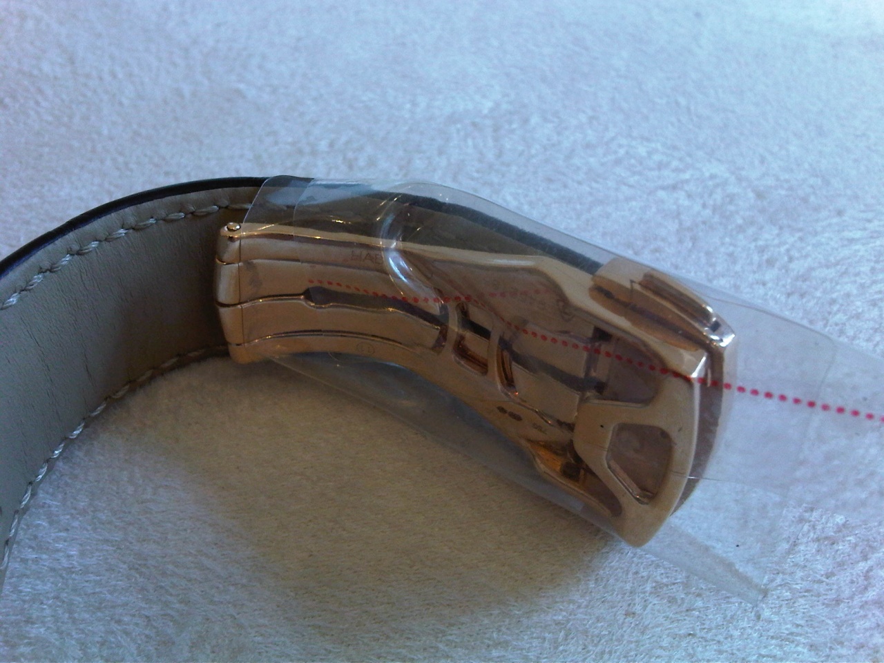 Розовое золото, коричневый крокодиловый ремешок с золотой застежкой (buckle), коричневый "тиковый" циферблат.