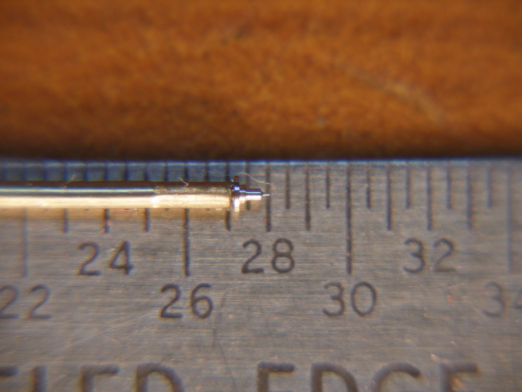 Извините, первоначально описывал ремонт колёс, поэтому баллансу не уделил должного внимания. У меня как у Плюшкина ничего не выкидывается, множество всяких баночек со старыми аксами (ось балланса), трибами, колесами. Поэтому найти старую ось (или новую) с подходящей цапфой не проблема, главное чтобы сама ось была не тоньше. Конечно чтобы её обработать нужна хотябы цанговая бабка или часовой токарный станочек. Подойдёт и приличная (без ощутимого поперечного люфта) бормашинка с набором цанг. Теперь самое главное, нужно закрепить нашу заготовку в цанге без биения. Кто точит, тот знает что это не просто, однако это просто. Берём цангу на 0.4 - 0.6мм. больше, вставляем в неё отожжённую латунную проволку (кусочек) диаматром цанги, на ходу штихелем или в станке резцом намечаем центр и засверливаем отверстие (опять-же на ходу) и подгоняем кализваром