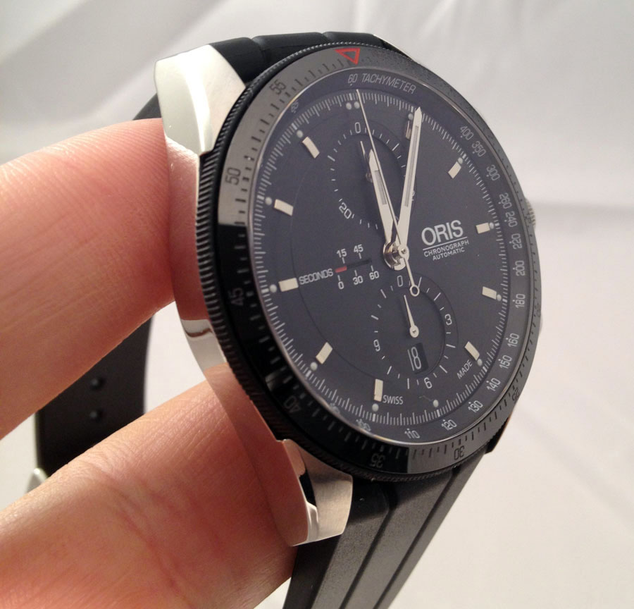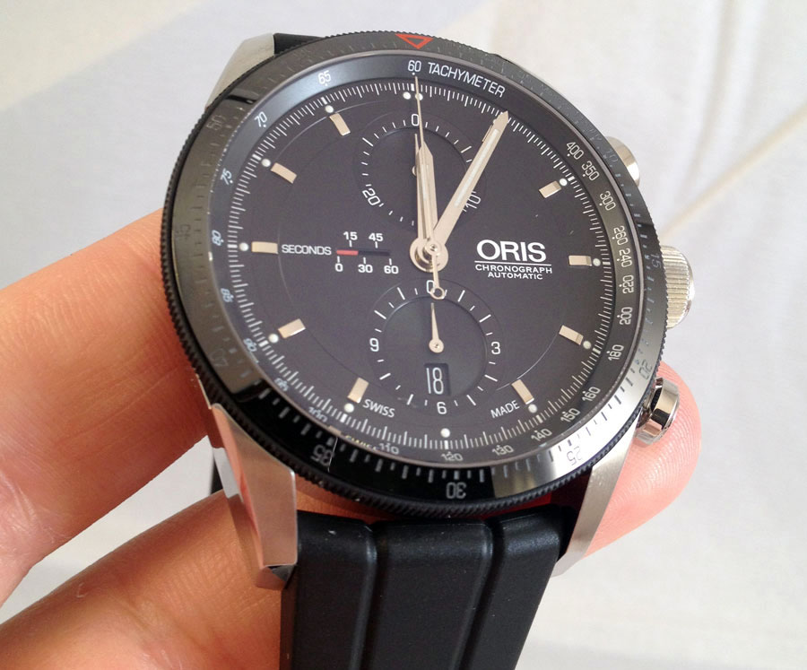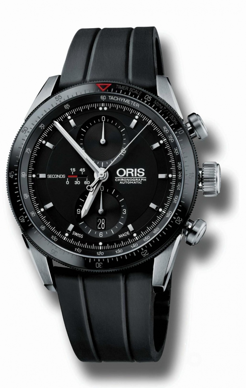 Новая модель Artix GT Chronograph (Ref. No. 674 7661 4434) от швейцарской часовой компании Oris имеет круглый корпус из нержавеющей стали, диаметром 44 мм, водонепроницаемый до 100 метров. Вращающийся черный керамический безель с минутной шкалой и с рифлением снаружи с резиновым покрытием. Сапфировое стекло защищает черный циферблат с накладными часовыми индексами, часовой и минутной стрелками с белым люминесцентным покрытием. На фланце расположена тахиметрическая шкала.