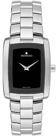 Корпус из нержавеющей стали с браслетом из нержавеющей стали. Форма корпуса: Прямоугольный. Отделка: Полированная и матовая. Черный циферблат с серебристыми часовой и минутной стрелками типа "дофин". Надпись movado и точка в позиции 12 часов. Кварцевый механизм. Устойчивое к царапинам изогнутое сапфировое стекло. Ширина: 22 мм. Толщина корпуса: 6 мм. Водонепроницаемость на 30 метров / 100 футов. Функции: часы, минуты.