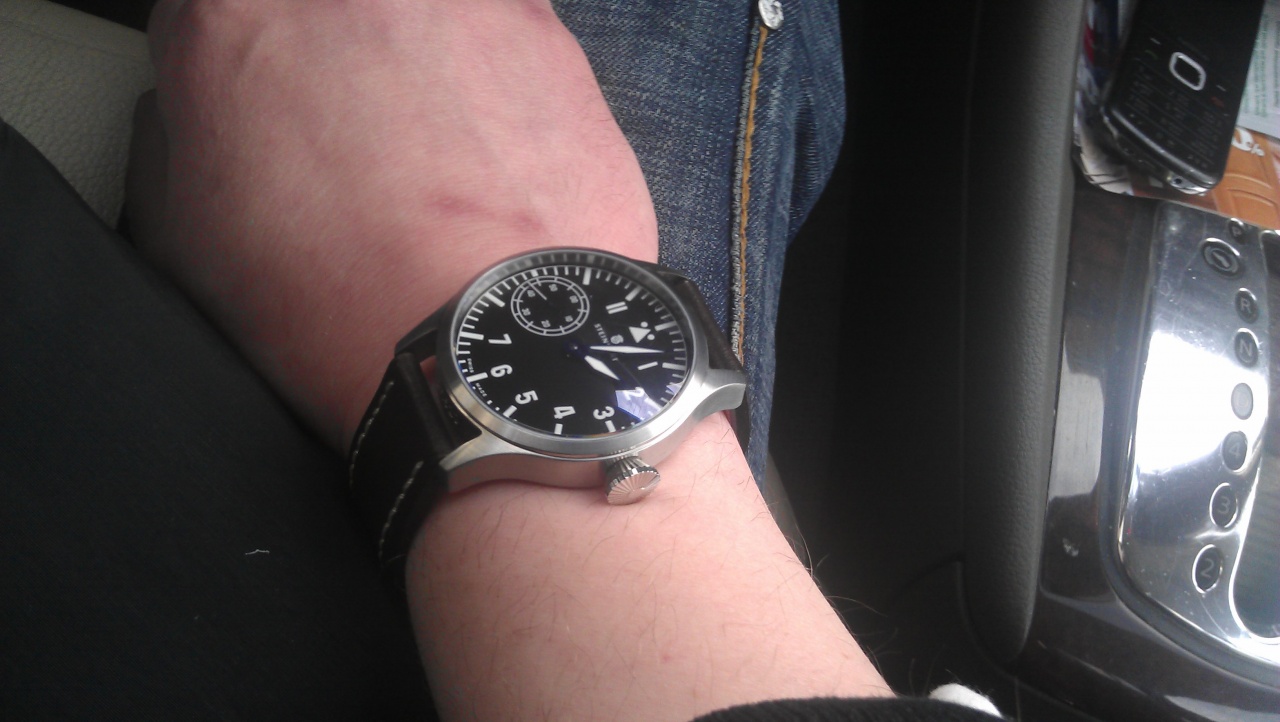 www.watchcenter.com.ua ,где внезапно Юрий Шапиро сказал что легко разбирется с проблемой и у меня будет автомат без логотипа и с алмазом , но ждать недели три . Я снова воспрял духом , но ....понял что не хочу автомат ., зато хочу прозрачную крышку . Тут на форуме увидел объявление от yuryspb ,понял что надо посмотреть в живую , встретился . Купил . Со вступлением все . Теперь про часы . Часы кайфовые ,алмазная голова им очень идет , воможность переодически пялиться на механизм через стекло -радует . Логотип довольно мелкий , хорошо вписан и не напрягает . Очень удачна отделка стрелок синим . Вынос секундной стрелки реально делает циферблат интересней , добовляет часам плюсов . 42 мм диаметра -как раз в сочетании с 14 мм высоты мне в самый раз .Ремень жестковат , закажу длинный . мягкий . Часы сделаны добротно . Наконец то матовый корпус . На мой вкус сочетание блестящего корпуса со средним размером делает часы «блестючей погремушкой » чувствую себя в таких часах папуасом , которому всучили обертку от шоколадки за дорого , от чего не купил Альпину (Конечно мое ИМХО ) .Покупкой доволен . В заключении пару фотов с телефона ( шо зробив то зробив)