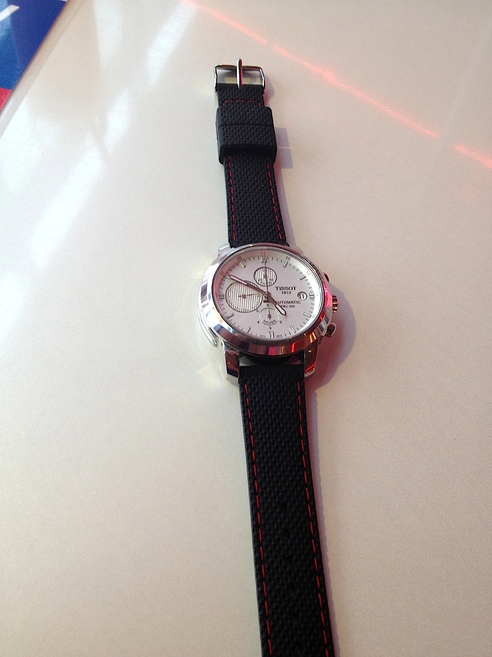 Случайно наткнулся вот на такой ремешок из силикона. Показалось, что красная строчка удачно дополнит скромные красные стрелки на циферблате. И вот что получилось!