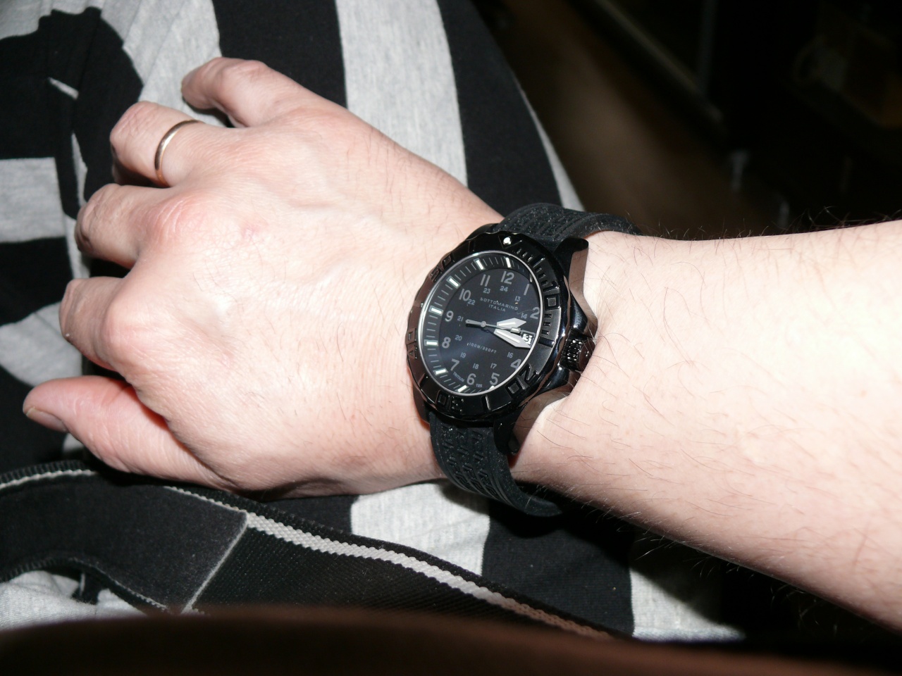 Добрый день или доброе утро всем форумчанам . Вашему вниманию хочу представить Sottomarino Lucciola с тритиевой подсветкой .Часы куплены у форумчанина , где то даже отзыв есть , хочу поделиться своими первыми впечатлениями. Часовой болезнью ранее не болел , вернее вообще не знал о существовании часов . А точнее телефон , в машине часы , в компьютере часы , везде часы.И вот как только исполнилось 40 прозрел )) Так как часы ношу не постоянно , связано с работой с красками и растворителями, то кварц основное требование.Начитавшись форума, естественно Сейко Кинетик , для меня это Тойота среди часов. Тойота для меня эталон надежности , функциональности , комфорта . По этому и Сейко )). Болезнь прогрессировала и вот уже у супруги Сейко с брюликами ))) Далее обострение и на 18 летие сына заказана Сейка спортура с будильником.потом были Раймонды , Милитаре , ну все вроде качественные часы . Ну а так как на весну совсем нет часов , да и зарплата далеко , то в глаза бросились часы неизвестной фирмы с завинчивающейся головкой ,тритиевой подсветкой ,сапфиром , вращающемся в одну сторону базелем , черным ПВД покрытием , датой ,большой секундной стрелкой , как я хотел , да еще и ценой в 150 уе, то брать или не брать вопрос не стоял .. Брать!!! Упаковка у часов неплохая , красивая оранжевая коробочка простроченная , с кнопкой . Из документов непонятные две бумажки , размером с билет на метро и шильдиком Sottomarino Lucciola.Общее впечатление от часов положительное. Стрелки четко попадают в метки. Я впервые увидел тритиевую подсветку , так как на сейко не тритий , и что могу сказать . Может я не понял что , но Сейко горит в темноте а эти не очень .. Может зарядить нужно , солнцем ) Посмотрим.На ощупь тяжелые качественные часы .Единственное что огорчило - это браслет. Браслет отвратителен во всем . В местах соединения звеньев браслета отсутствует напыление и видны , кстати сильно, желтого цвета металл . Это же присутствует и на ребрах ушек часов . Застежка браслета жидкая , фиксируется слабо .. То есть браслет напоминает то что продается во всех супермаркетах за 300 рублей. Но вообщем то часам за эту сумму простительно . Буду ставить каучук. Пока все впечатления . Позже дополню , если будет интересно Вам. Спасибо.