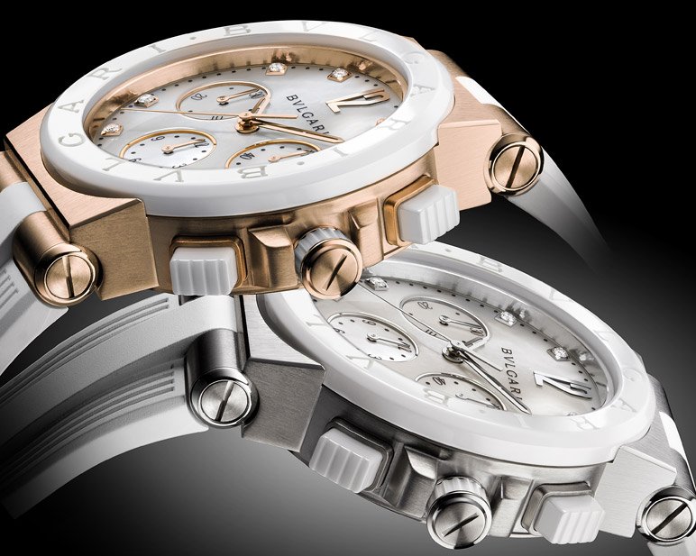 Новая модель Diagono Ceramic от Bvlgari, которая была представлена на завершившейся в прошлом месяце международной выставке Baselworld-2012, выпущена в мужской и женской версии, а также в нержавеющей стали или в 18-каратном розовом золоте.