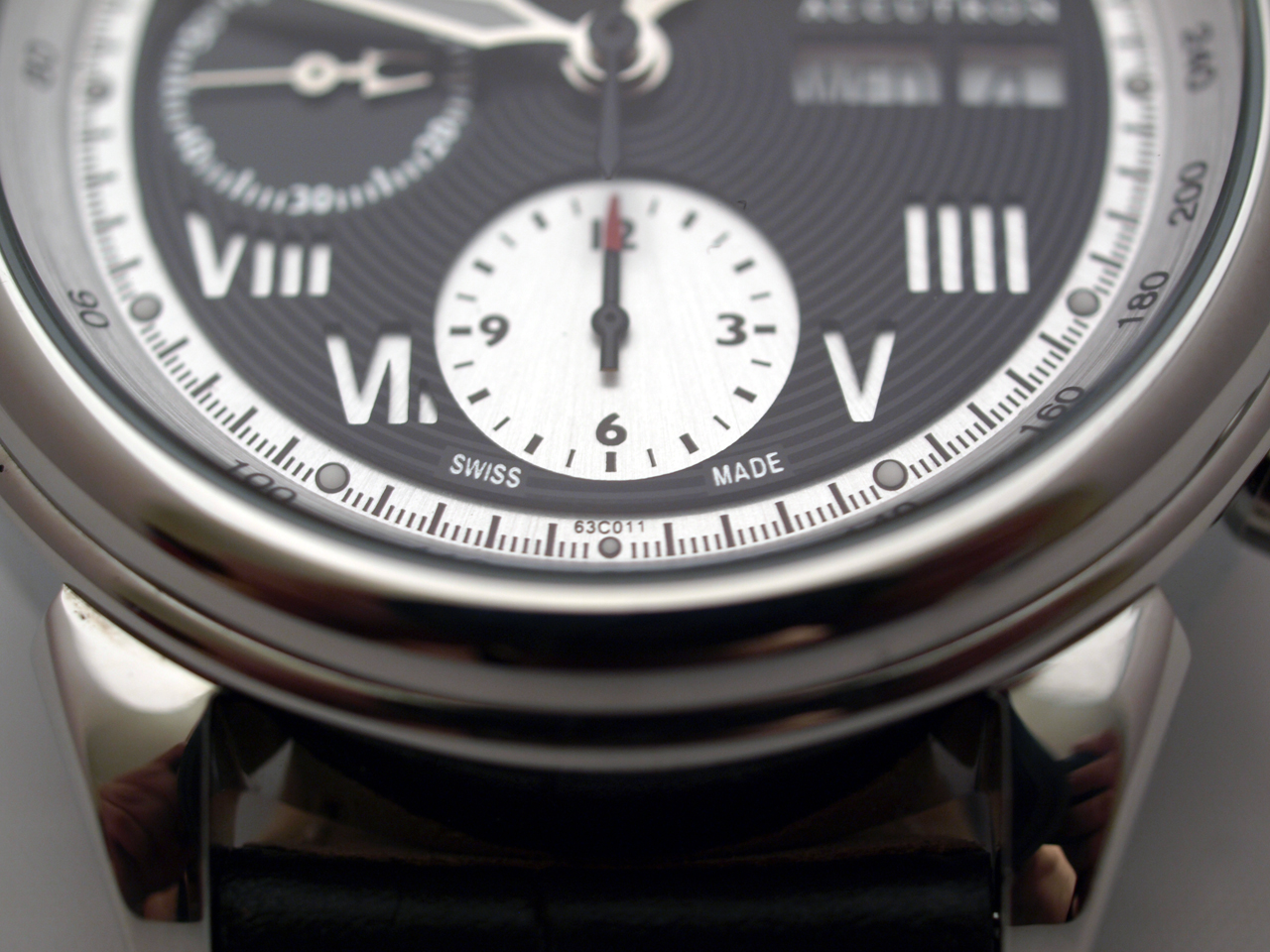 Циферблат: черный, гильошированный, прорезные римские цифры по циферблату, мини-циферблаты хронографа на отметках "12 часов" и "6 часов", секундный циферблат на отметке "9 часов", окно даты и дня недели на отметке "3 часа";
