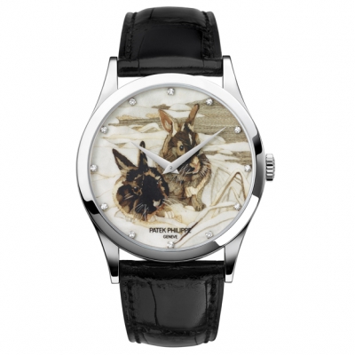 Маркетри из соломки или дерева создавали несколько брендов, но больше других преуспел Patek Philippe, представивший три миниатюры с кроликами в своем классическом корпусе Calatrava с ультратонким калибром 240, оснащенным автоматическим заводом. Часы были созданы к году кролика по китайскому календарю (2011-му), но актуальными они остаются весь 12-годичный цикл, да и во все последующие циклы. Неслучайно, публике их представили с некоторым опозданием – лишь на Baselworld 2012, когда по китайскому календарю давно уже наступил год дракона.