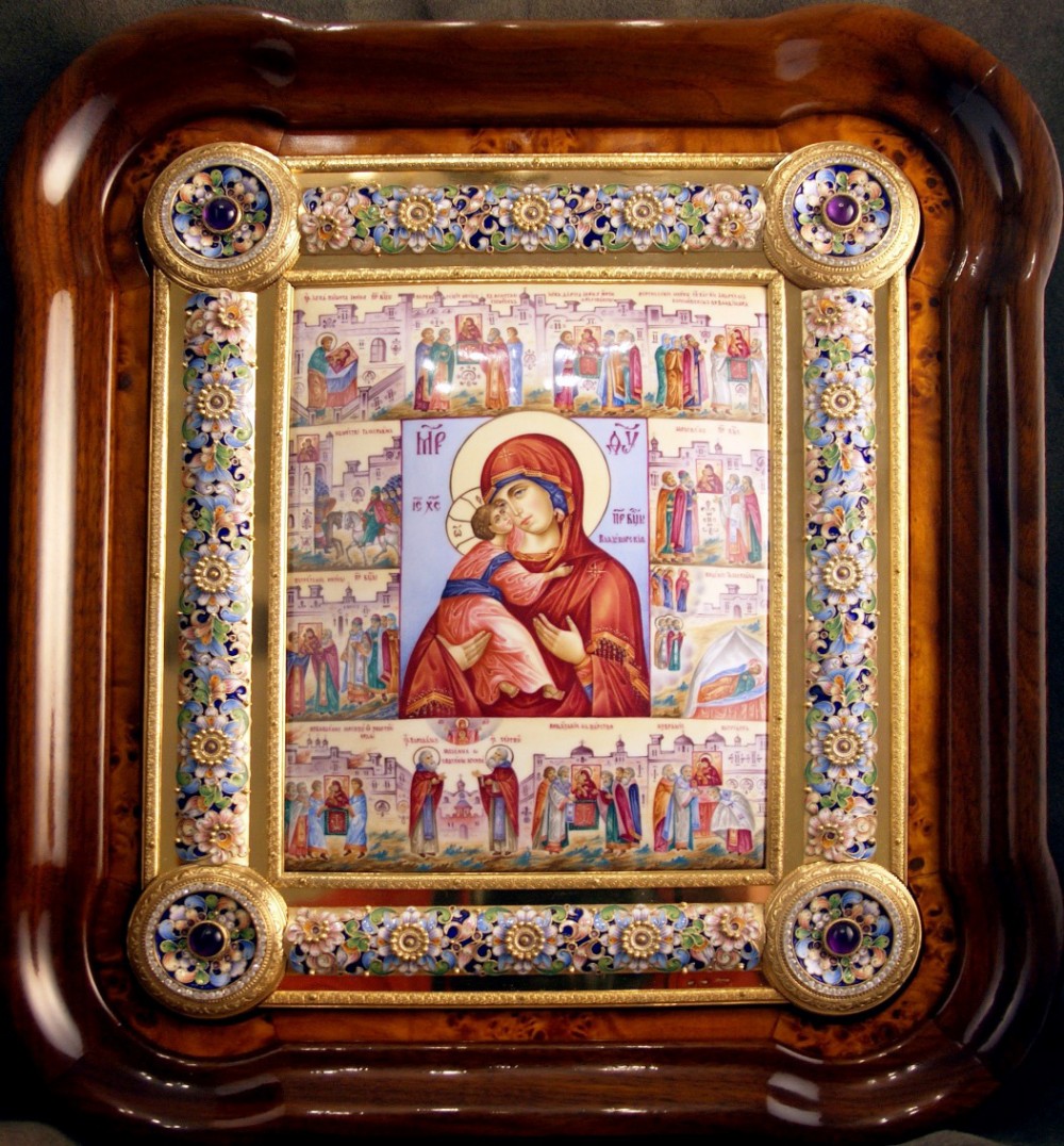 Икон в ювелирном исполнении. Владимирская Богородица является покровительницей России, к ней обращаются в любом затруднении, особенно, во время бедствия, о защите от врагов, об укреплении веры, о примирении враждующих, о смягчении сердец, а также об исцелении как телесных, так и душевных болезней. Перед Владимирской иконой Божией Матери во все века молились о сохранении России.